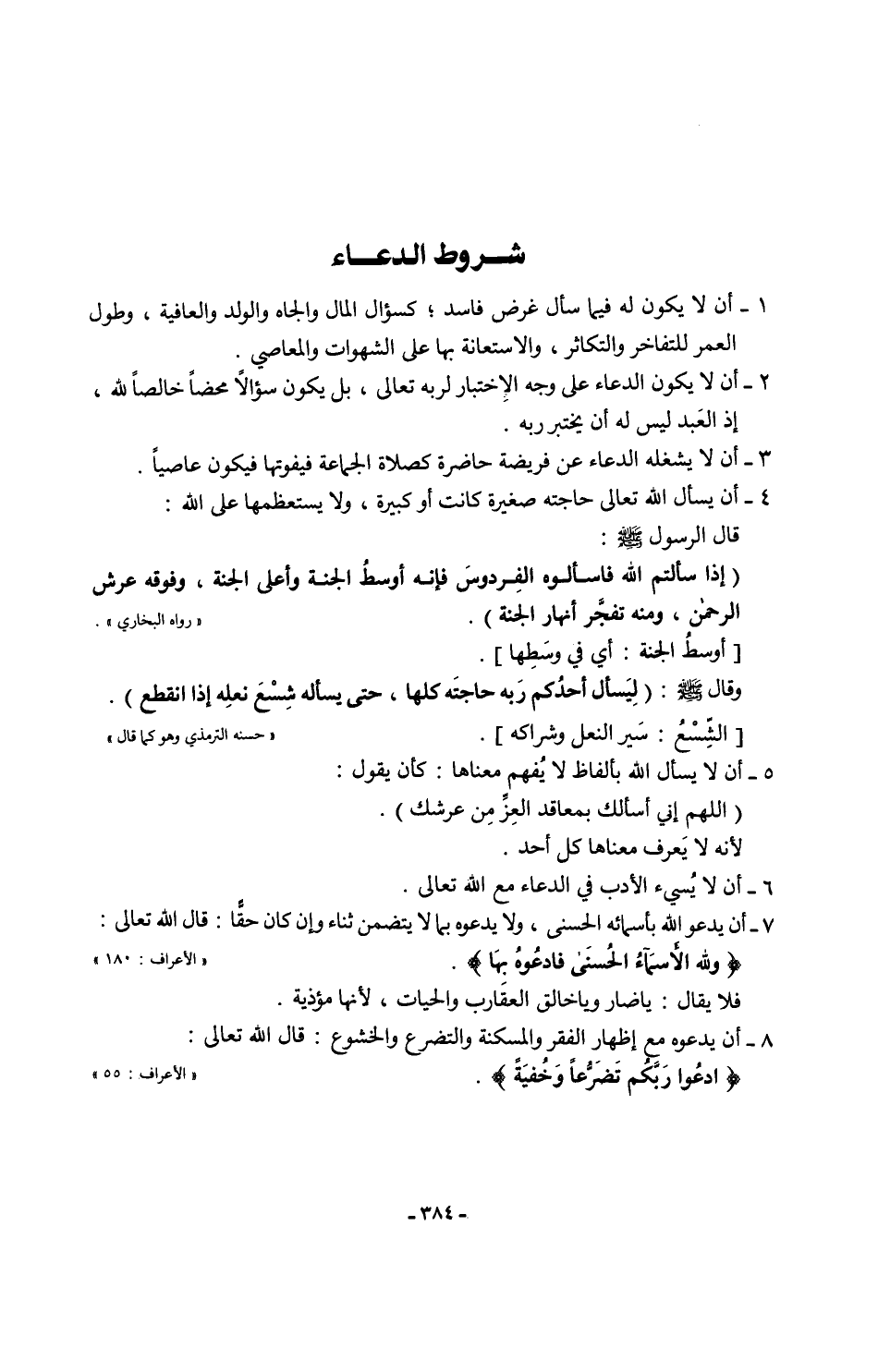 7 - أن يدعوا الله بأسمائه الحسنى، ولا يدعوه بما لا يتضمن ثناء وإن كان حقًا: قال الله تعالى: {وَلِلَّهِ الْأَسْمَاءُ الْحُسْنَى فَادْعُوهُ بِهَا}. "الأعراف: 180"