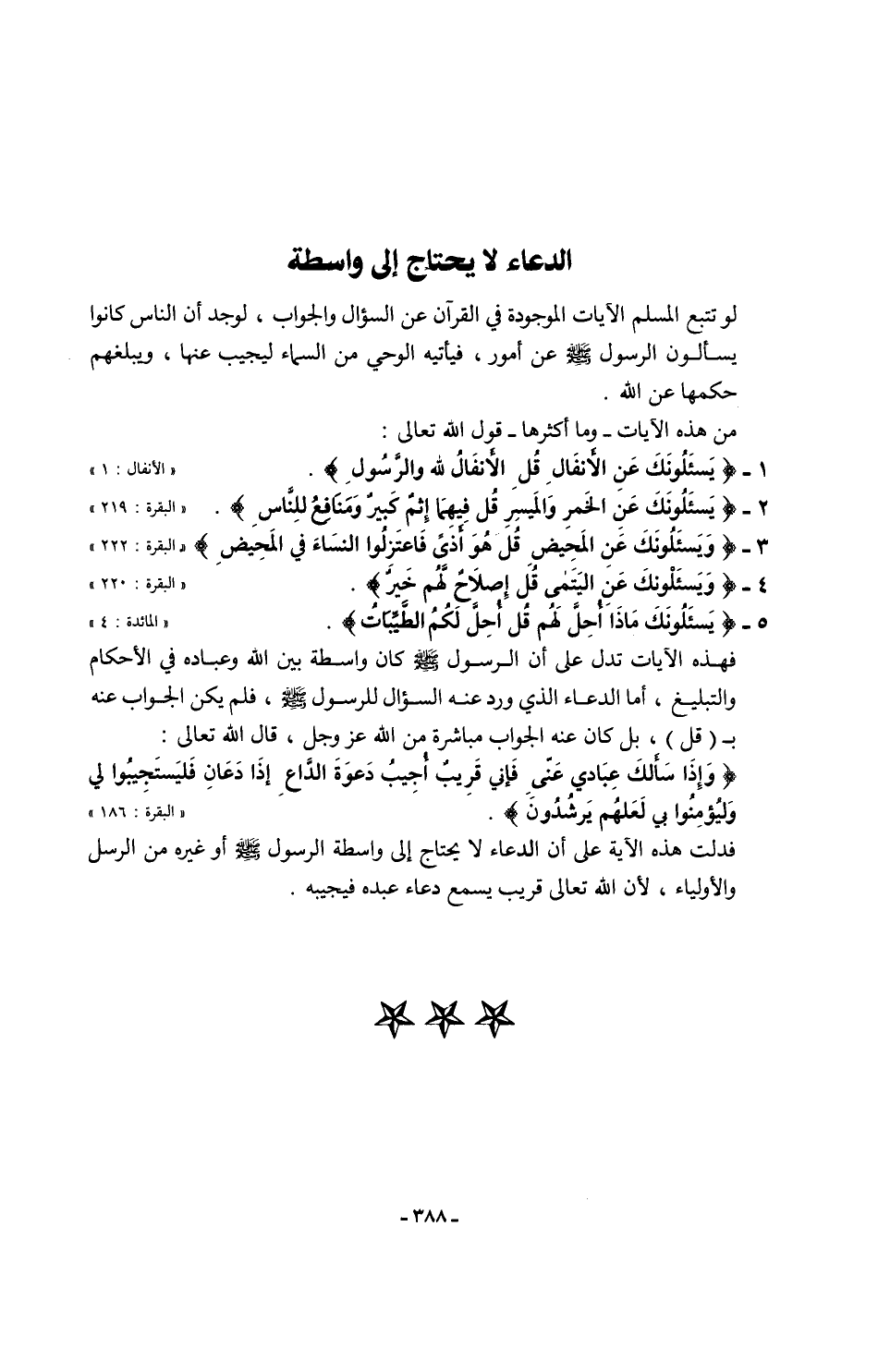 فهذه الآيات تدل على أن الرسول - صلى الله عليه وسلم - كان واسطة بين الله وعبادة في الأحكام والتبليغ، أما الدعاء الذي ورد عنه السؤال للرسول - صلى الله عليه وسلم -، فلم يكن الجواب عنه بـ (قل)، بل كان عنه الجواب مباشرة من الله -عَزَّ وَجَلَّ-، قال الله تعالى: