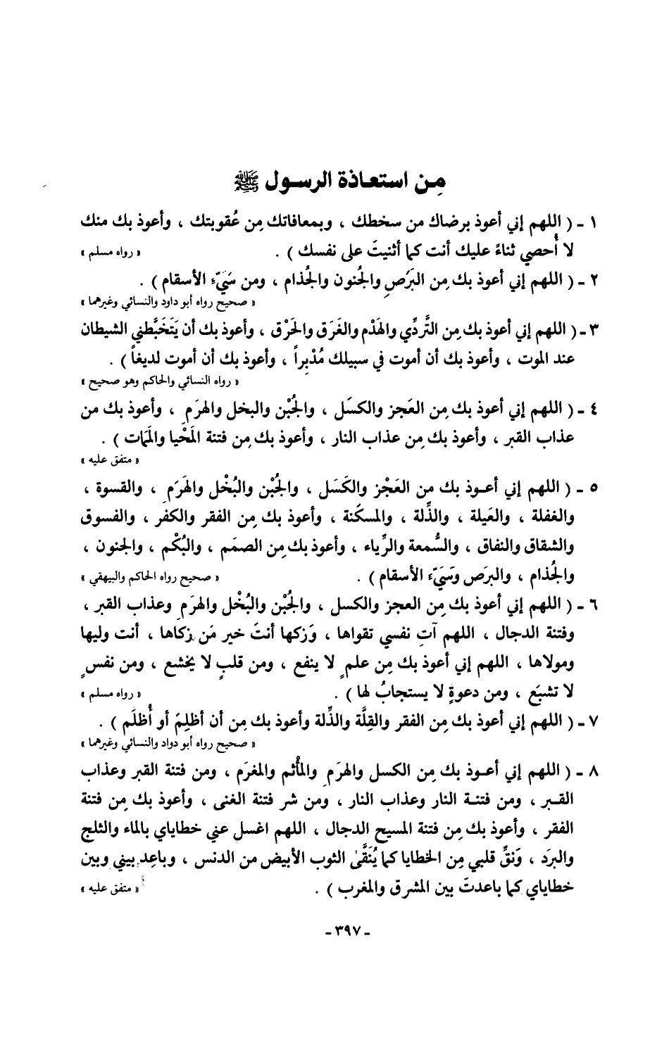 8 - (اللهم إني أعوذ بك مِن الكسل والهرَمِ والمأْثم والمغرَم، ومن فتنة القبر وعذاب القبر، ومن فتنة النار وعذاب النار، ومن شر فتنة الغنى، وأعوذ بك مِن فتنة الفقر، وأعوذ بك مِن فتنة المسيح الدجال، اللهم اغسل عني خطاياي بالماء والثلج والبرَد، وَنقِّ قلبي مِن الخطايا كما يُنَقَّى الثوب الأبيض من الدنس، وباعِد بيني وبين خطاياي كما باعدت بين المشرق والمغرب). "متفق عليه"