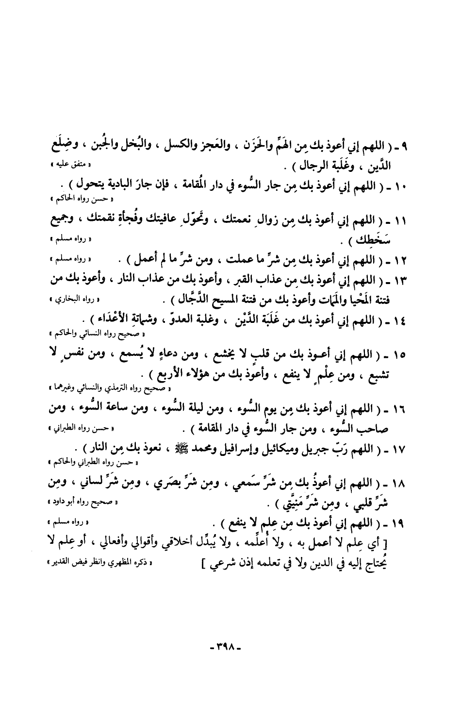 13 - (اللهم إني أعوذ بك مِن عذاب القبر، وأعوذ بك من عذاب النار، وأعوذ بك من فتنة المَحْيا والمَمَات وأعوذ بك من فتنة المسيح الدَّجَّال). "رواه البخاري"