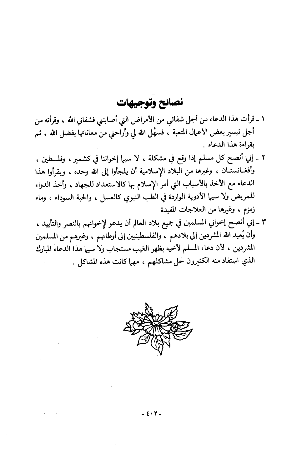 3 - إني أنصح إخواني المسلمين في جميع بلاد العالم أن يدعو لإخوانهم بالنصر والتأييد، وأن يُعبد الله المشردين إلى بلادهم، والفلسطينيين إلى أوطانهم، وغيرهم من المسلمين المشردين؛ لأن دعاء المسلم لأخيه بظهر الغيب مستجاب ولا سيما هذا الدعاء المبارك الذي استفاد منه الكثيرون لحل مشاكلهم، مهما كانت هذه المشاكل.