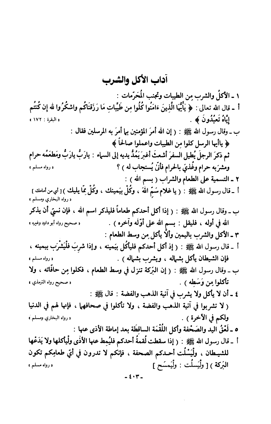 أ - قال رسول الله - صلى الله عليه وسلم -: (يا غلام سَمِّ الله، وكُلْ بيمينك، وكُلْ مِمّا يليك (1) [أي من أمامك] "رواه البخاري ومسلم"