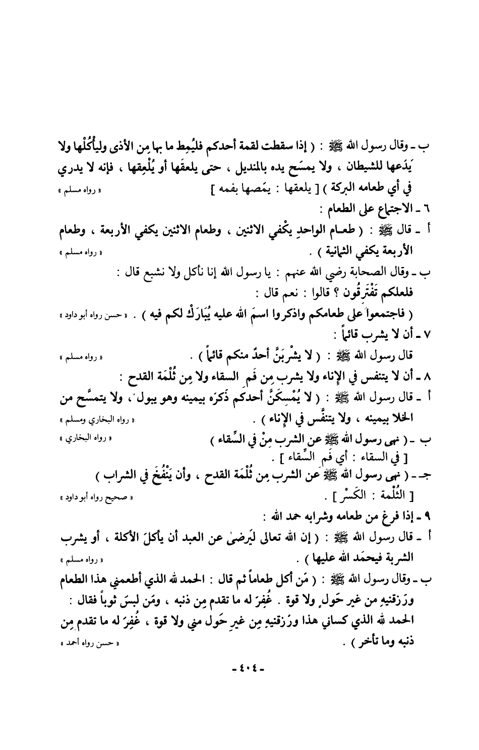 أ - قال رسول الله - صلى الله عليه وسلم -: (إن الله تعالى ليَرضى عن العبد أن يأكلَ الأكلة، أو يشرب الشربة فيحمَد الله عليها). "رواه مسلم"