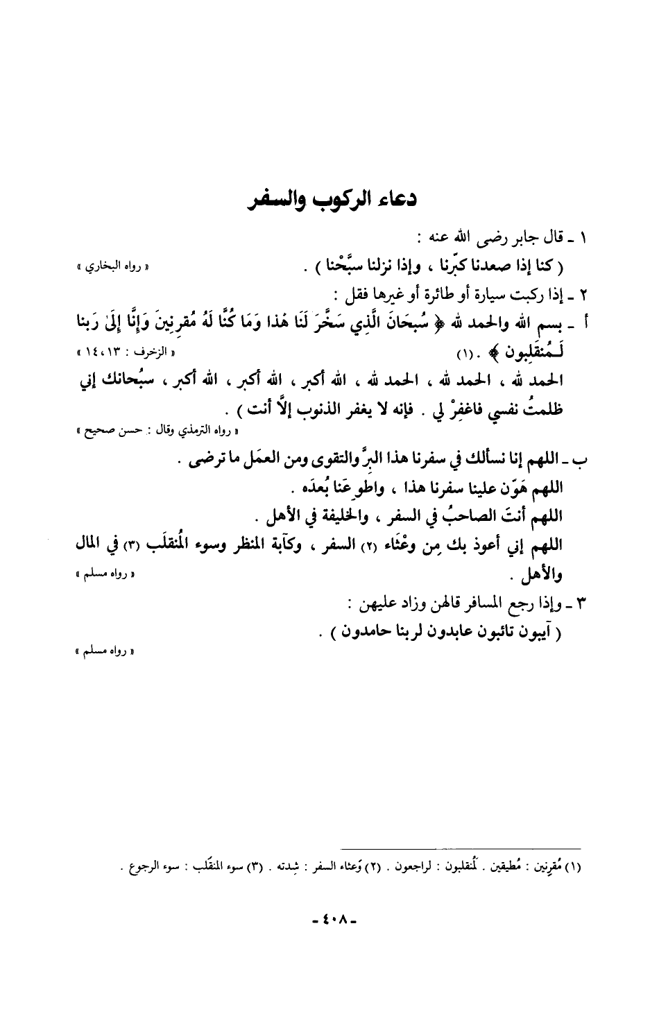 أ - بسم الله والحمد لله {سُبْحَانَ الَّذِي سَخَّرَ لَنَا هَذَا وَمَا كُنَّا لَهُ مُقْرِنِينَ وَإِنَّا إِلى رَبِّنَا لَمُنْقَلِبُونَ}. (¬1) "الزخرف: 13، 14"