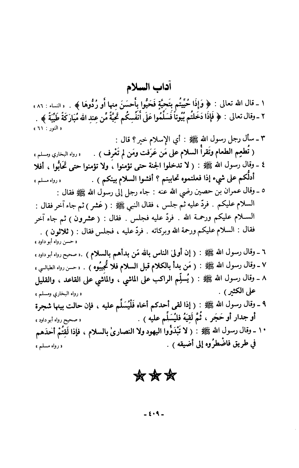 9 - وقال رسول الله - صلى الله عليه وسلم - (إذا لقى أحدكم أخاه فَلْيُسَلِّم عليه، فإن حالت بينها شجرة أو جدار أو حَجَر، ثُم لَقِيَهُ فليُسَلِّم عليه). "صحيح رواه أبو داود"