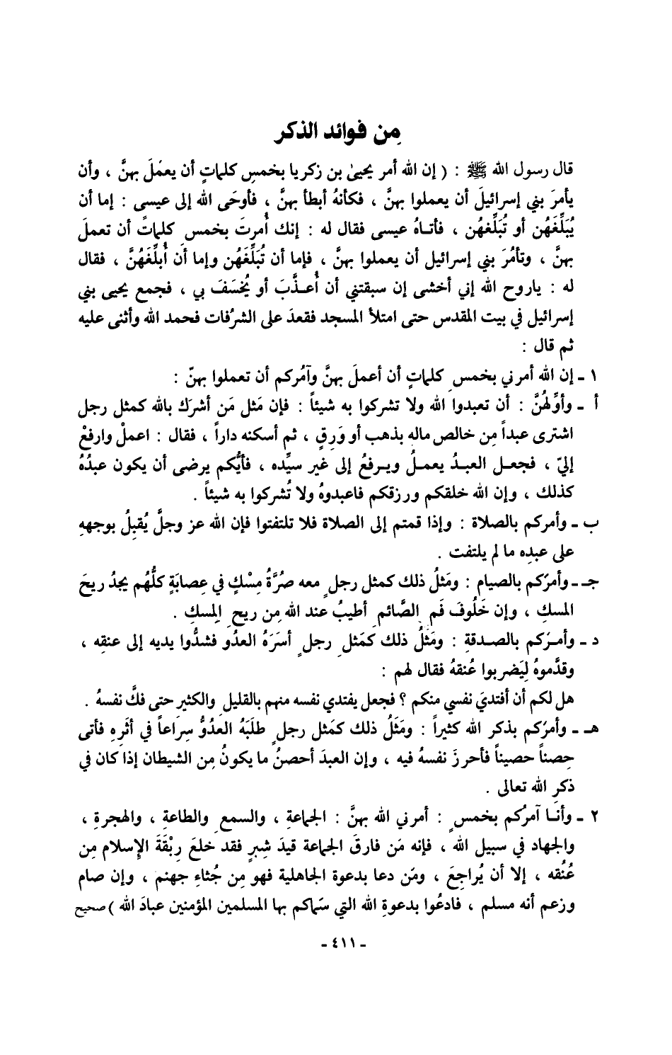 1 - إن الله أمرني بخمسِ كلماتٍ أن أعملَ بهنَّ وآمُركم أن تعملوا بهنّ: