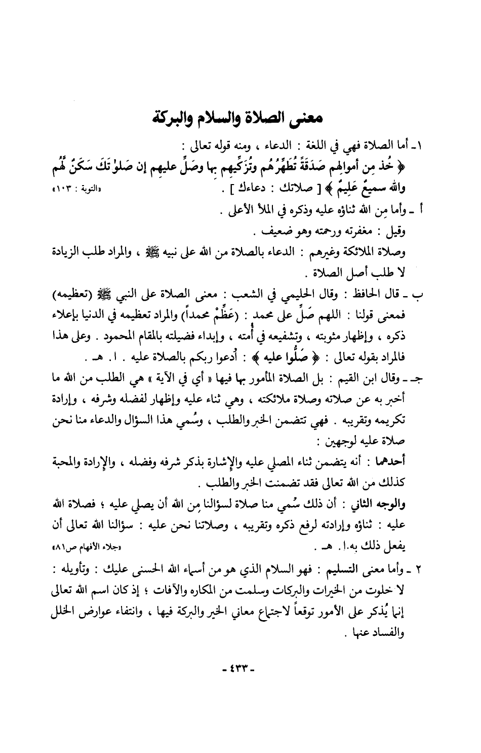 جـ - وقال ابن القيم: بل الصلاة المأمور بها فيها "أي في الآية" هي الطلب من الله ما أخبر به عن صلاته وصلاة ملائكته، وهي ثناء عليه وإظهار لفضله وشرفه، وإرادة تكريمه وتقريبه. فهي تتضمن الخبر والطلب، وسُمي هذا السؤال والدعاء منا نحن صلاة عليه لوجهين: