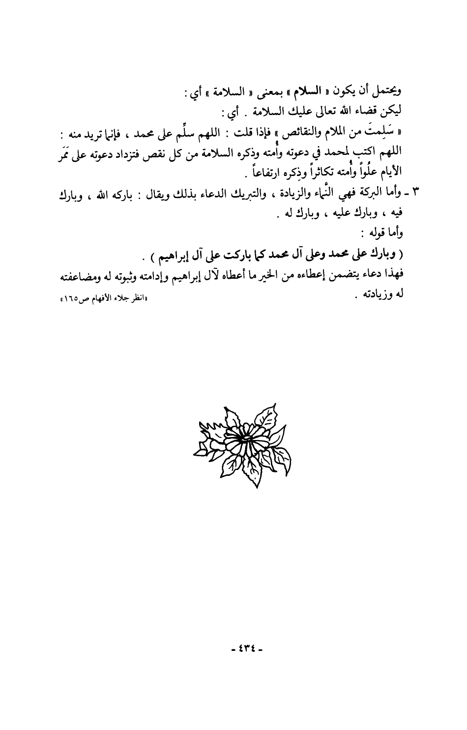 "سَلِمتَ من الملام والنقائص" فإذا قلت: اللهم سلِّم على محمد، فإنما تريد منه: اللهم اكتب لمحمد في دعوته وأُمته وذكره السلامة من كل نقص فتزداد دعوته على مَمَر الأيام علُوًا وأُمته تكاثرًا وذِكره ارتفاعًا.