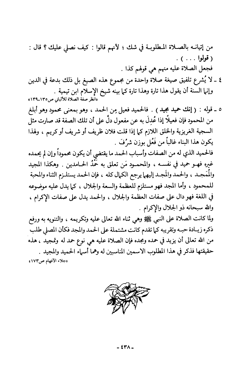 4 - لا يُشرع تلفيق صيغة صلاة واحدة من مجموع هذه الصيغ بل ذلك بدعة في الدين وإنما السنة أن يقول هذا تارة وهذا تارة كما بينه شيخ الإِسلام ابن تيمية. "انَظر صفة الصلاة للألباني ص 135 - 139"