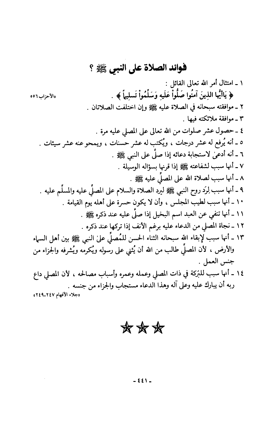14 - أنها سبب للبَركة في ذات المصلي وعمله وعمره وأسباب مصالحه؛ لأن المصلي داع ربه أن يبارك عليه وعلى آله وهذا الدعاء مستجاب والجزاء من جنسه. "جلاء الأفهام 247 - 249 "