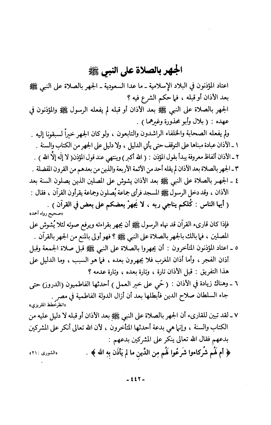 7 - لقد تبين للقارىء أن الجهر بالصلاة على النبي - صلى الله عليه وسلم - بعد الأذان أوقبله لا دليل عليه من الكتاب والسنة، وإنما هي بدعة أحدثها المتأخرون؛ لأن الله تعالى أنكر على المشركين بدعهم فقال الله تعالى ينكر على المشركين بدعهم: