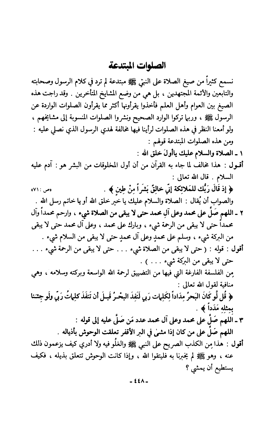 نسمع كثيرًا من صيغ الصلاة على النبي - صلى الله عليه وسلم - مبتدعة لم ترد في كلام الرسول وصحابته والتابعين والأئمة المجتهدين، بل هي من وضع المشايخ المتأخرين. وقد راجت هذه الصيغ بين العوام وأهل العلم فأخذوا يقرأونها أكثر مما يقرأون الصلوات الواردة عن الرسول - صلى الله عليه وسلم -، وربما تركوا الوارد الصحيح ونشروا الصلوات المنسوبة إلى مشايخهم، ولو أمعنا النظر في هذه الصلوات لرأينا فيها مخالفة لهدي الرسول الذي نصلي عليه: