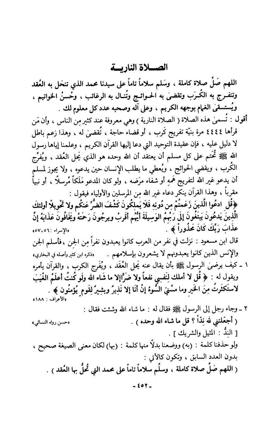 أقول: تُسمى هذه الصلاة (الصلاة النارية) وهي معروفة عند كثير مِن الناس، وأن مَن قرأها 4444 مرة بنيّة تفريج كَرب، أوقضاء حاجة، تُقضى له، وهذا زعم باطل لا دليل عليه، فإن عقيدة التوحيد التي دعا إليها القرآن الكريم، وعلمنا إياها رسوِل الله - صلى الله عليه وسلم - تُحَتم على كل مسلم أن يعتقد أن الله وحده هو الذي يَحل العُقد، ويُفرَج الكُرب، ويقضي الحوائج، ويُعطي ما يطلب الإِنسان حين يدعوه، ولا يجوز لمسلمٍ أن يدعو غير الله لتفريج هَمهِ أو شفاء مرَضه، ولو كان المدعو مَلَكًا مُرسلَا، أو نبيًا مقربًا، وهذا القرآن ينكر دعاء غير الله مِن المرسلين والأولياء فيقول: