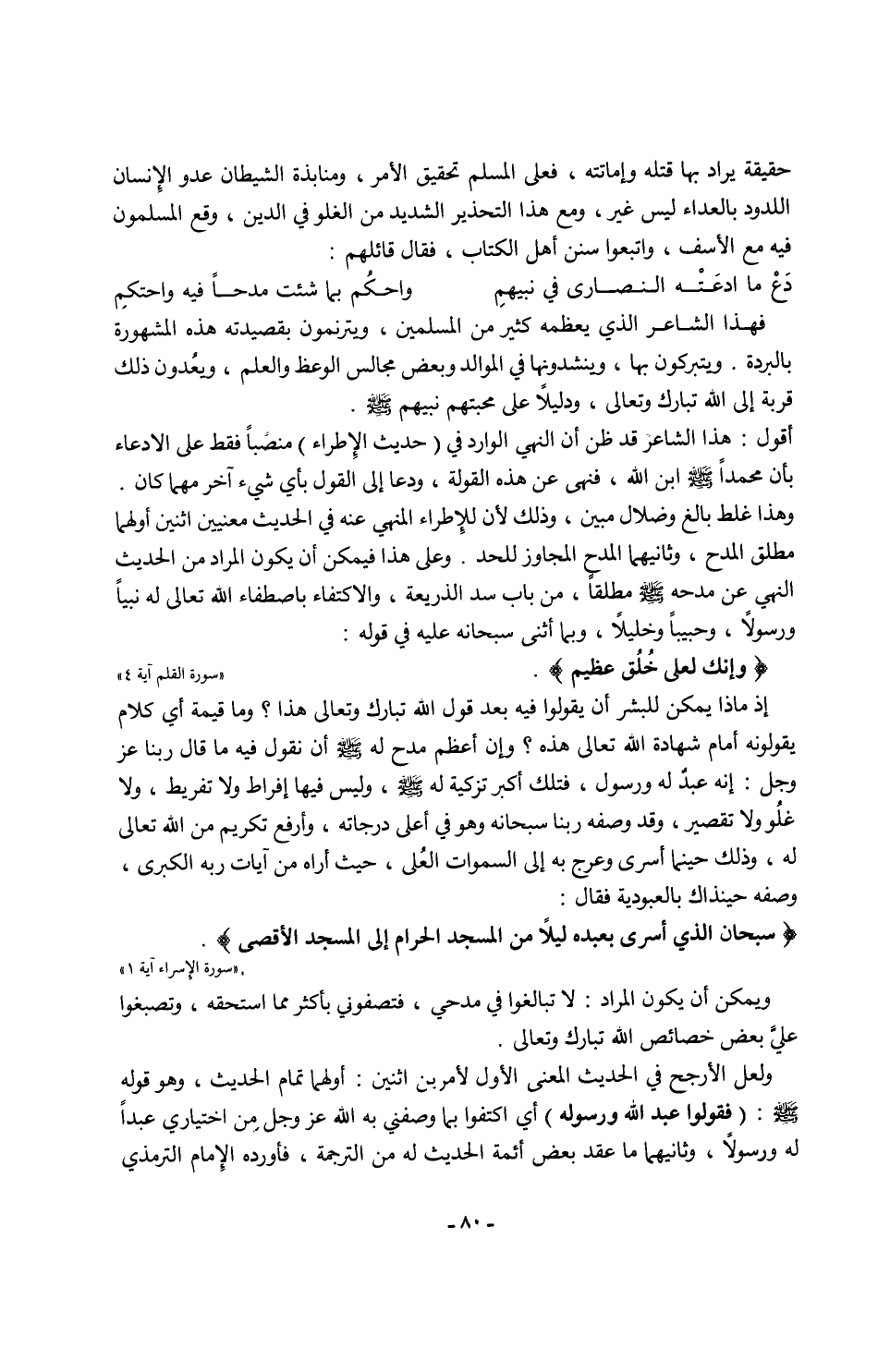 وهذا غلط بالغ وضلال مبين، وذلك لأن للإِطراء المنهي عنه في الحديث معنيين اثنين أولهما مطلق المدح، وثانيهما المدح المجاوز للحد. وعلى هذا فيمكن أن يكون المراد من الحديث النهي عن مدحه - صلى الله عليه وسلم - مطلقًا، من باب سد الذريعة، والإكتفاء باصطفاء الله تعالى له نبيًا ورسولًا، وحبيبًا وخليلًا، وبما أثنى سبحانه عليه في قوله: