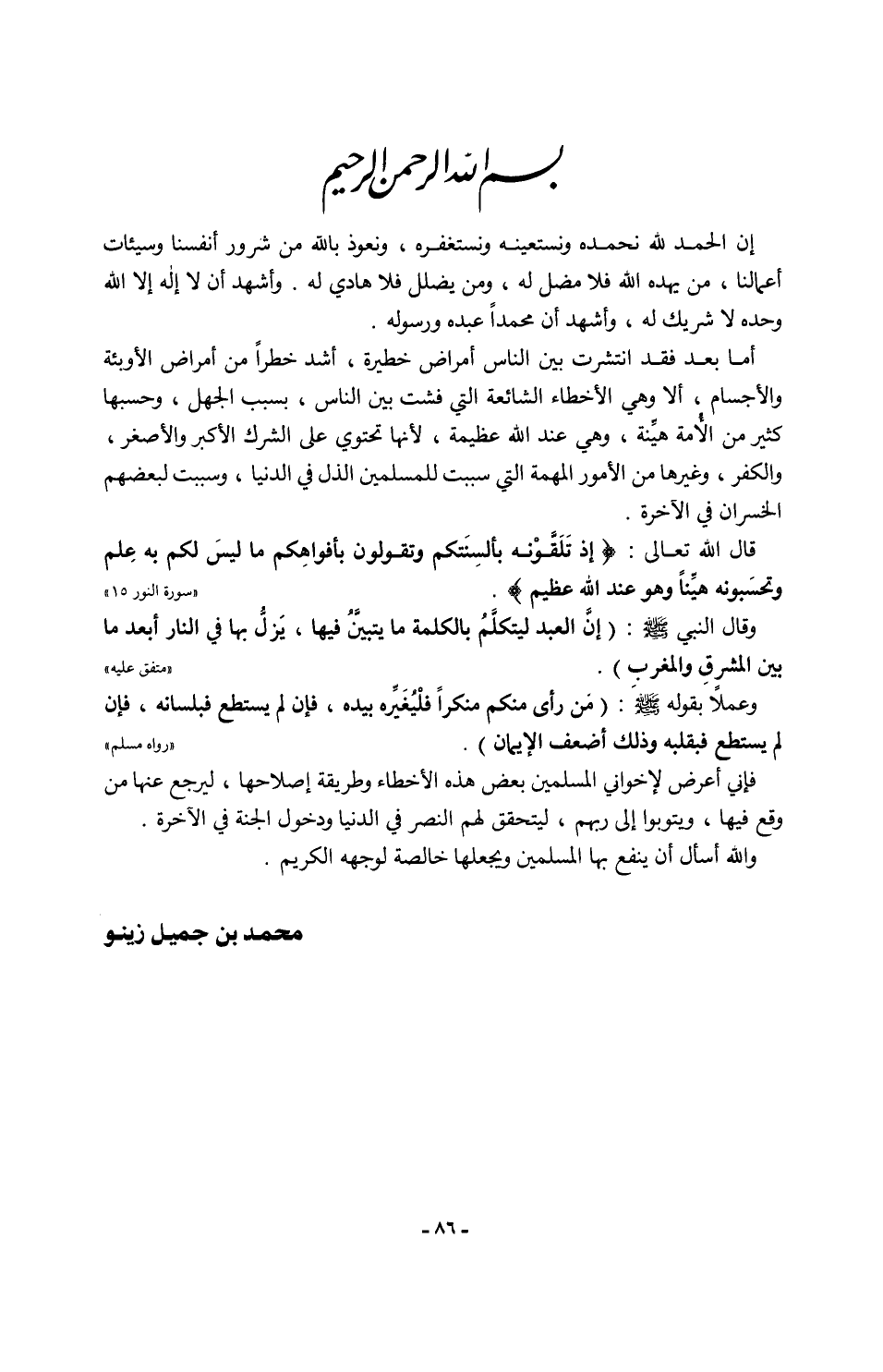 قال الله تعالى: {إِذْ تَلَقَّوْنَهُ بِأَلْسِنَتِكُمْ وَتَقُولُونَ بِأَفْوَاهِكُمْ مَا لَيْسَ لَكُمْ بِهِ عِلْمٌ وَتَحْسَبُونَهُ هَيِّنًا وَهُوَ عِنْدَ اللَّهِ عَظِيمٌ}. "سورة النور 15"