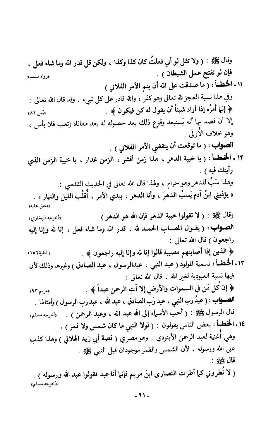 13 - الخطأ: تسمية المولود (عبد النبي، عبد الرسول، عبد الصادق) وغيرها وذلك لأن فيها نسبة العبودية لغير الله. قال الله تعالى: