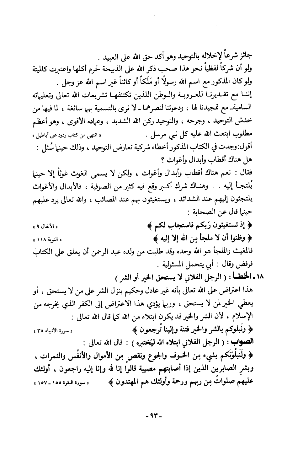 أقول: وجدت في الكتاب المذكور أخطاء شركية تعارض التوحيد، وذلك حينما سُئل: هل هناك أقطاب وأبدال وأغواث؟