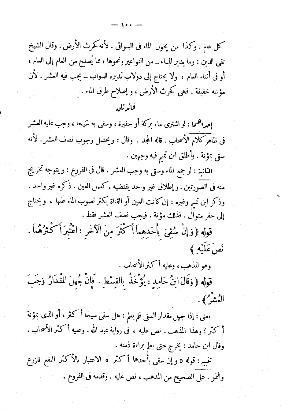 فَائِدَتَانِ. إحْدَاهُمَا: لَوْ اشْتَرَى مَاءَ بِرْكَةٍ أَوْ حَفِيرَةٍ، وَسَقَى بِهِ سَيْحًا، وَجَبَ عَلَيْهِ الْعُشْرُ فِي ظَاهِرِ كَلَامِ الْأَصْحَابِ، قَالَهُ الْمَجْدُ، وَقَالَ: وَيُحْتَمَلُ وُجُوبُ نِصْفِ الْعُشْرِ؛ لِأَنَّهُ سُقِيَ بِمُؤْنَةٍ، وَأَطْلَقَ ابْنُ تَمِيمٍ فِيهِ وَجْهَيْنِ. الثَّانِيَةُ: لَوْ جَمَعَ الْمَاءَ وَسَقَى بِهِ وَجَبَ الْعُشْرُ، قَالَ فِي الْفُرُوعِ: وَيَتَوَجَّهُ تَخْرِيجٌ مِنْهُ فِي الصُّورَتَيْنِ، وَإِطْلَاقُ غَيْرِ وَاحِدٍ يَقْتَضِيهِ، كَعَمَلِ الْعَيْنِ، ذَكَرَهُ غَيْرُ وَاحِدٍ، وَذَكَرَ ابْنُ تَمِيمٍ وَغَيْرُهُ: إنْ كَانَتْ الْعَيْنُ أَوْ الْقَنَاةُ يَكْثُرُ تَصَوُّبُ الْمَاءِ عَنْهَا، وَيُحْتَاجُ إلَى حَفْرٍ مُتَوَالٍ، فَذَلِكَ مُؤْنَةٌ، فَيَجِبُ نِصْفُ الْعُشْرِ فَقَطْ.