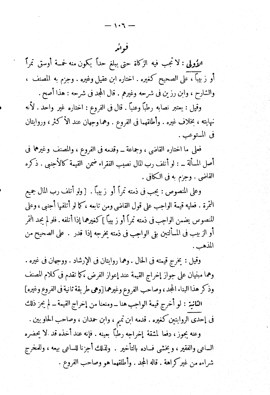 فَوَائِدُ. الْأُولَى: لَا تَجِبُ فِيهِ الزَّكَاةُ حَتَّى يَبْلُغَ حَدًّا يَكُونُ مِنْهُ خَمْسَةُ أَوْسُقٍ تَمْرًا أَوْ زَبِيبًا، عَلَى الصَّحِيحِ كَغَيْرِهِ، اخْتَارَهُ ابْنُ عَقِيلٍ وَغَيْرُهُ. وَجَزَمَ بِهِ الْمُصَنِّفُ، وَالشَّارِحُ، وَابْنُ رَزِينٍ فِي شَرْحِهِ وَغَيْرُهُمْ. قَالَ الْمَجْدُ فِي شَرْحِهِ: هَذَا أَصَحُّ، وَقِيلَ: يُعْتَبَرُ نِصَابُهُ رُطَبًا وَعِنَبًا. قَالَ فِي الْفُرُوعِ: اخْتَارَهُ غَيْرُ وَاحِدٍ؛ لِأَنَّهُ نِهَايَتُهُ، بِخِلَافِ غَيْرِهِ، وَأَطْلَقَهُمَا فِي الْفُرُوعِ، وَهُمَا وَجْهَانِ عِنْدَ الْأَكْثَرِ، وَرِوَايَتَانِ فِي الْمُسْتَوْعِبِ، فَعَلَى مَا اخْتَارَهُ الْقَاضِي، وَجَمَاعَةٌ وَقَدَّمَهُ فِي الْفُرُوعِ، وَالْمُصَنِّفُ وَغَيْرِهِمَا فِي أَصْلِ الْمَسْأَلَةِ: لَوْ أَتْلَفَ رَبُّ الْمَالِ نَصِيبَ الْفُقَرَاءِ ضَمِنَ الْقِيمَةَ كَالْأَجْنَبِيِّ. ذَكَرَهُ الْقَاضِي، وَجَزَمَ بِهِ فِي الْكَافِي، وَعَلَى الْمَنْصُوصِ: يَجِبُ فِي ذِمَّتِهِ تَمْرًا أَوْ زَبِيبًا. [وَلَوْ أَتْلَفَ رَبُّ الْمَالِ جَمِيعَ الثَّمَرَةِ، فَعَلَيْهِ قِيمَةُ الْوَاجِبِ عَلَى قَوْلِ الْقَاضِي وَمَنْ تَابَعَهُ كَمَا لَوْ أَتْلَفَهَا أَجْنَبِيٌّ، وَعَلَى الْمَنْصُوصِ يَضْمَنُ الْوَاجِبَ فِي ذِمَّتِهِ تَمْرًا أَوْ زَبِيبًا] كَغَيْرِهِمَا إذَا أَتْلَفَهُ، فَلَوْ لَمْ يَجُدَّ التَّمْرَ أَوْ الزَّبِيبَ فِي الْمَسْأَلَتَيْنِ بَقِيَ الْوَاجِبُ فِي ذِمَّتِهِ يُخْرِجُهُ إذَا قَدَرَ. عَلَى الصَّحِيحِ مِنْ الْمَذْهَبِ، وَقِيلَ: يُخْرِجُ قِيمَتَهُ فِي الْحَالِ، وَهُمَا رِوَايَتَانِ فِي الْإِرْشَادِ، وَوَجْهَانِ فِي غَيْرِهِ، وَهُمَا مَبْنِيَّانِ عَلَى جَوَازِ إخْرَاجِ الْقِيمَةِ عِنْدَ إعْوَازِ الْفَرْضِ، كَمَا تَقَدَّمَ فِي كَلَامِ الْمُصَنِّفِ وَذَكَرَ هَذَا الْبِنَاءَ الْمَجْدُ، وَصَاحِبُ الْفُرُوعِ وَغَيْرُهُمَا [وَهِيَ طَرِيقَةٌ ثَانِيَةٌ فِي الْفُرُوعِ وَغَيْرِهِ] الثَّانِيَةُ: لَوْ أَخْرَجَ قِيمَةَ الْوَاجِبِ هُنَا وَمَنَعْنَا مِنْ إخْرَاجِ الْقِيمَةِ لَمْ يَجُزْ ذَلِكَ فِي إحْدَى الرِّوَايَتَيْنِ كَغَيْرِهِ، قَدَّمَهُ ابْنُ تَمِيمٍ، وَابْنُ حَمْدَانَ، وَصَاحِبُ الْحَاوِيَيْنِ، وَعَنْهُ يَجُوزُ، دَفْعًا لِمَشَقَّةِ إخْرَاجِهِ رُطَبًا بِعَيْنِهِ، فَإِنَّهُ عِنْدَ أَخْذِهِ قَدْ لَا يَحْضُرُهُ السَّاعِي وَالْفَقِيرُ، وَيُخْشَى فَسَادُهُ بِالتَّأْخِيرِ. وَلِذَلِكَ أَجَزْنَا لِلسَّاعِي بَيْعَهُ، وَلِلْمُخْرِجِ شِرَاءَهُ مِنْ غَيْرِ كَرَاهَةٍ. قَالَهُ الْمَجْدُ، وَأَطْلَقَهُمَا هُوَ وَصَاحِبُ الْفُرُوعِ.