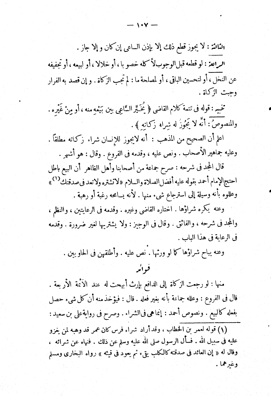 فَوَائِدُ. مِنْهَا: لَوْ رَجَعَتْ الزَّكَاةُ إلَى الدَّافِعِ بِإِرْثٍ أُبِيحَتْ لَهُ عِنْدَ الْأَئِمَّةِ الْأَرْبَعَةِ، قَالَ فِي الْفُرُوعِ: وَعَلَّلَهُ جَمَاعَةٌ بِأَنَّهُ بِغَيْرِ فِعْلِهِ. قَالَ: فَيُؤْخَذُ مِنْهُ أَنَّ كُلَّ شَيْءٍ حَصَلَ بِفِعْلِهِ كَالْبَيْعِ، وَنُصُوصُ أَحْمَدَ: إنَّمَا هِيَ فِي الشِّرَاءِ، وَصَرَّحَ فِي رِوَايَةِ عَلِيِّ بْنِ سَعِيدٍ: