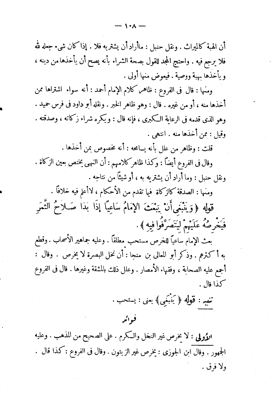 أَنَّ الْهِبَةَ كَالْمِيرَاثِ، وَنَقَلَ حَنْبَلٌ: مَا أَرَادَ أَنْ يَشْتَرِيَهُ فَلَا. إذَا كَانَ شَيْءٌ جَعَلَهُ لِلَّهِ فَلَا يَرْجِعُ فِيهِ. وَاحْتَجَّ الْمَجْدُ لِلْقَوْلِ بِصِحَّةِ الشِّرَاءِ بِأَنَّهُ يَصِحُّ أَنْ يَأْخُذَهَا مِنْ دَيْنِهِ، وَيَأْخُذُهَا بِهِبَةٍ وَوَصِيَّةٍ، فَيُعَوَّضُ مِنْهَا أَوْلَى، وَمِنْهَا: قَالَ فِي الْفُرُوعِ: ظَاهِرُ كَلَامِ الْإِمَامِ أَحْمَدَ: أَنَّهُ سَوَاءٌ اشْتَرَاهَا مِمَّنْ أَخَذَهَا مِنْهُ، أَوْ مِنْ غَيْرِهِ. قَالَ: وَهُوَ ظَاهِرُ الْخَبَرِ، وَنَقَلَهُ أَبُو دَاوُد فِي فَرَسِ حُمَيْدٍ، وَهُوَ الَّذِي قَدَّمَهُ فِي الرِّعَايَةِ الْكُبْرَى، فَإِنَّهُ قَالَ: وَيُكْرَهُ شِرَاءُ زَكَاتِهِ، وَصَدَقَتِهِ، وَقِيلَ: مِمَّنْ أَخَذَهَا مِنْهُ. انْتَهَى.