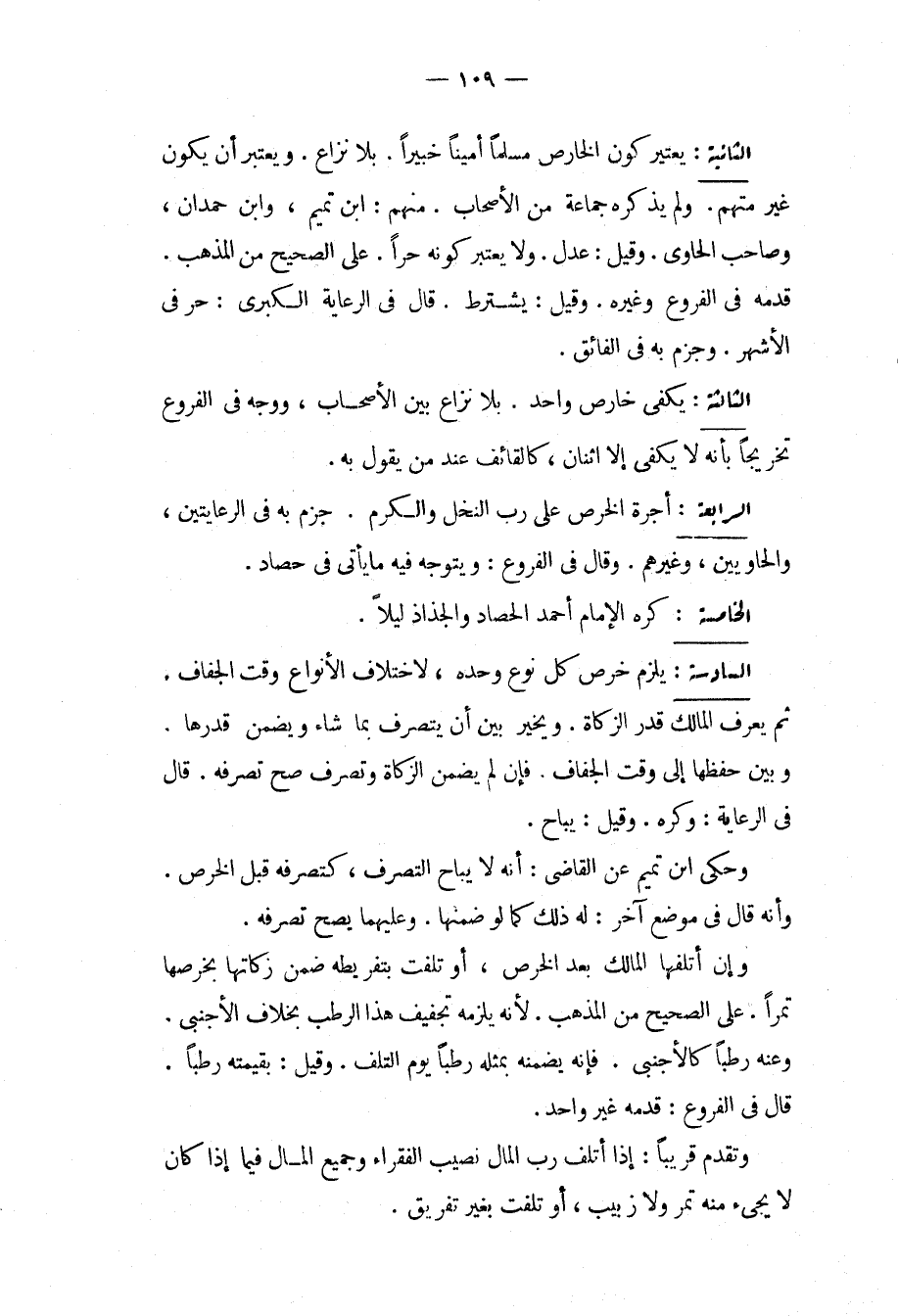 الثَّالِثَةُ: يَكْفِي خَارِصٌ وَاحِدٌ. بِلَا نِزَاعٍ بَيْنَ الْأَصْحَابِ، وَوَجَّهَ فِي الْفُرُوعِ تَخْرِيجًا بِأَنَّهُ لَا يَكْفِي إلَّا اثْنَانِ، كَالْقَائِفِ عِنْدَ مَنْ يَقُولُ بِهِ. الرَّابِعَةُ: أُجْرَةُ الْخَرْصِ عَلَى رَبِّ النَّخْلِ وَالْكَرْمِ، جَزَمَ بِهِ فِي الرِّعَايَتَيْنِ، وَالْحَاوِيَيْنِ، وَغَيْرِهِمْ، وَقَالَ فِي الْفُرُوعِ: وَيَتَوَجَّهُ فِيهِ مَا يَأْتِي فِي حَصَادٍ. الْخَامِسَةُ: كَرِهَ الْإِمَامُ أَحْمَدُ الْحَصَادَ وَالْجِذَاذَ لَيْلًا. السَّادِسَةُ: يَلْزَمُ خَرْصُ كُلِّ نَوْعٍ وَحْدَهُ، لِاخْتِلَافِ الْأَنْوَاعِ وَقْتَ الْجَفَافِ ثُمَّ يَعْرِفُ الْمَالِكُ قَدْرَ الزَّكَاةِ، وَيُخَيَّرُ بَيْنَ أَنْ يَتَصَرَّفَ بِمَا شَاءَ وَيَضْمَنُ قَدْرَهَا، وَبَيْنَ حِفْظِهَا إلَى وَقْتِ الْجَفَافِ، فَإِنْ لَمْ يَضْمَنْ الزَّكَاةَ وَتَصَرَّفَ صَحَّ تَصَرُّفُهُ. قَالَ فِي الرِّعَايَةِ: وَكُرِهَ، وَقِيلَ: يُبَاحُ، وَحَكَى ابْنُ تَمِيمٍ عَنْ الْقَاضِي: أَنَّهُ لَا يُبَاحُ التَّصَرُّفُ، كَتَصَرُّفِهِ قَبْلَ الْخَرْصِ، وَأَنَّهُ قَالَ فِي مَوْضِعٍ آخَرَ: لَهُ ذَلِكَ كَمَا لَوْ ضَمِنَهَا، وَعَلَيْهِمَا يَصِحُّ تَصَرُّفُهُ، وَإِنْ أَتْلَفَهَا الْمَالِكُ بَعْدَ الْخَرْصِ، أَوْ تَلِفَتْ بِتَفْرِيطِهِ ضَمِنَ زَكَاتَهَا بِخَرْصِهَا تَمْرًا عَلَى الصَّحِيحِ مِنْ الْمَذْهَبِ؛ لِأَنَّهُ يَلْزَمُهُ تَجْفِيفُ هَذَا الرُّطَبِ بِخِلَافِ الْأَجْنَبِيِّ، وَعَنْهُ رُطَبًا كَالْأَجْنَبِيِّ، فَإِنَّهُ يَضْمَنُهُ بِمِثْلِهِ رُطَبًا يَوْمَ التَّلَفِ. وَقِيلَ: بِقِيمَتِهِ رُطَبًا، قَالَ فِي الْفُرُوعِ: قَدَّمَهُ غَيْرُ وَاحِدٍ، وَتَقَدَّمَ قَرِيبًا: إذَا أَتْلَفَ رَبُّ الْمَالِ نَصِيبَ الْفُقَرَاءِ وَجَمِيعَ الْمَالِ فِيمَا إذَا كَانَ لَا يَجِيءُ مِنْهُ تَمْرٌ وَلَا زَبِيبٌ أَوْ تَلِفَتْ بِغَيْرِ تَفْرِيقٍ.