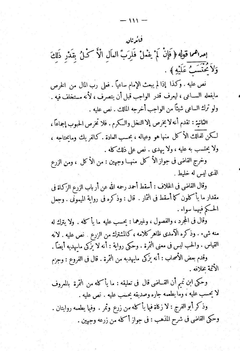 فَائِدَتَانِ إحْدَاهُمَا قَوْلُهُ (فَإِنْ لَمْ يَفْعَلْ فَلِرَبِّ الْمَالِ الْأَكْلُ بِقَدْرِ ذَلِكَ وَلَا يُحْتَسَبُ عَلَيْهِ) ، نَصَّ عَلَيْهِ، وَكَذَا إذَا لَمْ يَبْعَثْ الْإِمَامُ سَاعِيًا، فَعَلَى رَبِّ الْمَالِ مِنْ الْخَرْصِ مَا يَفْعَلُهُ السَّاعِي، لِيَعْرِفَ قَدْرَ الْوَاجِبِ قَبْلَ أَنْ يَتَصَرَّفَ، لِأَنَّهُ مُسْتَخْلَفٌ فِيهِ، وَلَوْ تَرَكَ السَّاعِي شَيْئًا مِنْ الْوَاجِبِ أَخْرَجَهُ الْمَالِكُ، نَصَّ عَلَيْهِ. الثَّانِيَةُ: تَقَدَّمَ أَنَّهُ لَا يُخْرَصُ إلَّا النَّخْلُ وَالْكَرْمُ، فَلَا تُخْرَصُ الْحُبُوبُ إجْمَاعًا، لَكِنْ لِلْمَالِكِ الْأَكْلُ مِنْهَا هُوَ وَعِيَالُهُ، بِحَسَبِ الْعَادَةِ. كَالْفَرِيكِ وَمَا يَحْتَاجُهُ، وَلَا يُحْتَسَبُ بِهِ عَلَيْهِ، وَلَا يُهْدَى. نَصَّ عَلَى ذَلِكَ كُلِّهِ، وَخَرَّجَ الْقَاضِي فِي جَوَازِ الْأَكْلِ مِنْهَا وَجْهَيْنِ: مِنْ الْأَكْلِ، وَمِنْ الزَّرْعِ الَّذِي لَيْسَ لَهُ خَلِيطٌ، وَقَالَ الْقَاضِي فِي الْخِلَافِ: أَسْقَطَ أَحْمَدُ - رَحِمَهُ اللَّهُ - عَنْ أَرْبَابِ الزَّرْعِ الزَّكَاةَ فِي مِقْدَارِ مَا يَأْكُلُونَ كَمَا أَسْقَطَ فِي الثِّمَارِ. قَالَ: وَذَكَرَهُ فِي رِوَايَةِ الْمَيْمُونِيِّ، وَجَعَلَ الْحُكْمَ فِيهِمَا سَوَاءً، وَقَالَ فِي الْمُجَرَّدِ، وَالْفُصُولِ، وَغَيْرِهِمَا: يُحْسَبُ عَلَيْهِ مَا يَأْكُلُهُ، وَلَا يُتْرَكُ لَهُ مِنْهُ شَيْءٌ، وَذَكَرَهُ الْآمِدِيُّ ظَاهِرُ كَلَامِهِ، كَالْمُشْتَرَكِ مِنْ الزَّرْعِ نَصَّ عَلَيْهِ؛ لِأَنَّهُ الْقِيَاسُ، وَالْحَبُّ لَيْسَ فِي مَعْنَى الثَّمَرَةِ، وَحَكَى رِوَايَةً: أَنَّهُ لَا يُزَكِّي مَا يُهْدِيهِ أَيْضًا، وَقَدَّمَ بَعْضُ الْأَصْحَابِ: أَنَّهُ يُزَكِّي مَا يَهْدِيهِ مِنْ الثَّمَرَةِ. قَالَ فِي الْفُرُوعِ: وَجَزَمَ الْأَئِمَّةُ بِخِلَافِهِ، وَحَكَى ابْنُ تَمِيمٍ أَنَّ الْقَاضِيَ قَالَ فِي تَعْلِيقِهِ: مَا يَأْكُلُهُ مِنْ التَّمْرَةِ بِالْمَعْرُوفِ لَا يُحْسَبُ عَلَيْهِ، وَمَا يُطْعِمُهُ جَارَهُ وَصَدِيقَهُ يُحْسَبُ عَلَيْهِ، نَصَّ عَلَيْهِ، وَذَكَرَ أَبُو الْفَرَجِ: لَا زَكَاةَ فِيمَا يَأْكُلُهُ مِنْ زَرْعٍ وَثَمَرٍ، وَفِيمَا يُطْعِمُهُ رِوَايَتَانِ، وَحَكَى الْقَاضِي فِي شَرْحِ الْمُذْهَبِ: فِي جَوَازِ أَكْلِهِ مِنْ زَرْعِهِ وَجْهَيْنِ.