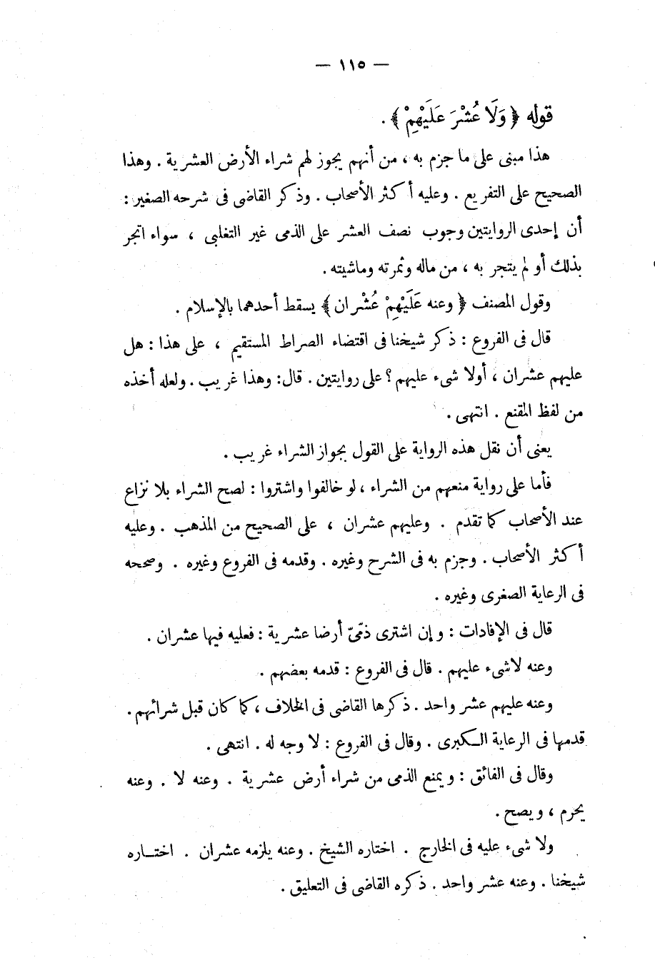 قَوْلُهُ (وَلَا عُشْرَ عَلَيْهِمْ) . هَذَا مَبْنِيٌّ عَلَى مَا جَزَمَ بِهِ، مِنْ أَنَّهُمْ يَجُوزُ لَهُمْ شِرَاءُ الْأَرْضِ الْعُشْرِيَّةِ. وَهَذَا الصَّحِيحُ عَلَى التَّفْرِيعِ، وَعَلَيْهِ أَكْثَرُ الْأَصْحَابِ. وَذَكَرَ الْقَاضِي فِي شَرْحِهِ الصَّغِيرِ: أَنَّ إحْدَى الرِّوَايَتَيْنِ وُجُوبُ نِصْفِ الْعُشْرِ عَلَى الذِّمِّيِّ غَيْرِ التَّغْلِبِيِّ، سَوَاءٌ اتَّجَرَ بِذَلِكَ أَوْ لَمْ يَتَّجِرْ بِهِ، مِنْ مَالِهِ وَثَمَرَتِهِ وَمَاشِيَتِهِ، وَقَوْلُ الْمُصَنِّفِ (وَعَنْهُ عَلَيْهِمْ عُشْرَانِ) يَسْقُطُ أَحَدُهُمَا بِالْإِسْلَامِ، قَالَ فِي الْفُرُوعِ: ذَكَرَ شَيْخُنَا فِي اقْتِضَاءِ الصِّرَاطِ الْمُسْتَقِيمِ، عَلَى هَذَا: هَلْ عَلَيْهِمْ عُشْرَانِ، أَوْ لَا شَيْءَ عَلَيْهِمْ؟ عَلَى رِوَايَتَيْنِ. قَالَ: وَهَذَا غَرِيبٌ، وَلَعَلَّهُ أَخَذَهُ مِنْ لَفْظِ الْمُقْنِعِ. انْتَهَى.