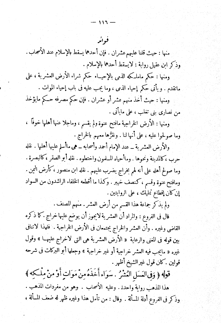 فَوَائِدُ مِنْهَا: حَيْثُ قُلْنَا عَلَيْهِمْ عُشْرَانِ، فَإِنَّ أَحَدَهُمَا يَسْقُطُ بِالْإِسْلَامِ عِنْدَ الْأَصْحَابِ، وَذَكَرَ ابْنُ عَقِيلٍ رِوَايَةً: لَا يَسْقُطُ أَحَدُهُمَا بِالْإِسْلَامِ، وَمِنْهَا: حُكْمُ مَا مَلَكَهُ الذِّمِّيُّ بِالْإِحْيَاءِ حُكْمُ شِرَاءِ الْأَرْضِ الْعُشْرِيَّةِ، عَلَى مَا تَقَدَّمَ. وَيَأْتِي حُكْمُ إحْيَاءِ الذِّمِّيِّ، وَمَا يَجِبُ عَلَيْهِ فِي بَابِ إحْيَاءِ الْمَوَاتِ، وَمِنْهَا: حَيْثُ أُخِذَ مِنْهُمْ عُشْرٌ أَوْ عُشْرَانِ، فَإِنَّ حُكْمَ مَصْرِفِهِ حُكْمُ مَا يُؤْخَذُ مِنْ نَصَارَى بَنِي تَغْلِبَ، عَلَى مَا يَأْتِي، وَمِنْهَا: الْأَرْضُ الْخَرَاجِيَّةُ مَا فُتِحَ عَنْوَةً وَلَمْ يُقَسَّمْ، وَمَا جَلَا عَنْهَا أَهْلُهَا خَوْفًا، وَمَا صُولِحُوا عَلَيْهِ، عَلَى أَنَّهَا لَنَا، وَنُقِرُّهَا مَعَهُمْ بِالْخَرَاجِ، وَالْأَرْضُ الْعُشْرِيَّةُ عِنْدَ الْإِمَامِ أَحْمَدَ وَأَصْحَابِهِ هِيَ مَا أَسْلَمَ عَلَيْهَا أَهْلُهَا. نَقَلَهُ حَرْبٌ كَالْمَدِينَةِ وَنَحْوِهَا، وَمَا أَحْيَاهُ الْمُسْلِمُونَ وَاخْتَطُّوهُ. نَقَلَهُ أَبُو الصَّقْرِ، كَالْبَصْرَةِ، وَمَا صُولِحَ أَهْلُهُ عَلَى أَنَّهُ لَهُمْ بِخَرَاجٍ يُضْرَبُ عَلَيْهِمْ. نَقَلَهُ ابْنُ مَنْصُورٍ، كَأَرْضِ الْيَمَنِ، وَمَا فُتِحَ عَنْوَةً وَقُسِمَ، كَنِصْفِ خَيْبَرَ، وَكَذَا مَا أَقَطَعَهُ الْخُلَفَاءُ الرَّاشِدُونَ مِنْ السَّوَادِ إنْ كَانَ إقْطَاعُ تَمْلِيكٍ، عَلَى الرِّوَايَتَيْنِ، وَلَمْ يَذْكُرْ جَمَاعَةٌ هَذَا الْقِسْمَ مِنْ أَرْضِ الْعُشْرِ. مِنْهُمْ الْمُصَنِّفُ، قَالَ فِي الْفُرُوعِ: وَالْمُرَادُ أَنَّ الْعُشْرِيَّةَ لَا يَجُوزُ أَنْ يُوضَعَ عَلَيْهَا خَرَاجٌ كَمَا ذَكَرَهُ الْقَاضِي وَغَيْرُهُ، وَأَنَّ الْعُشْرَ وَالْخَرَاجَ يَجْتَمِعَانِ فِي الْأَرْضِ الْخَرَاجِيَّةِ، فَلِهَذَا لَا تَنَافِيَ بَيْنَ قَوْلِهِ فِي الْمُغْنِي وَالرِّعَايَةِ " الْأَرْضُ الْعُشْرِيَّةُ هِيَ الَّتِي لَا خَرَاجَ عَلَيْهَا " وَقَوْلِ غَيْرِهِ " مَا يَجِبُ فِيهِ الْعُشْرُ خَرَاجِيَّةً أَوْ غَيْرَ خَرَاجِيَّةٍ " وَجَعَلَهَا أَبُو الْبَرَكَاتِ فِي شَرْحِهِ قَوْلَيْنِ. كَانَ قَوْلُ غَيْرِ الشَّيْخِ أَظْهَرَ.