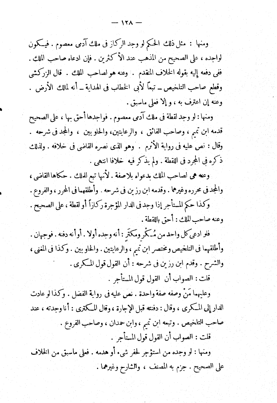وَمِنْهَا: مِثْلُ ذَلِكَ الْحُكْمِ لَوْ وَجَدَ الرِّكَازَ فِي مِلْكِ آدَمِيٍّ مَعْصُومٍ، فَيَكُونُ لِوَاجِدِهِ، عَلَى الصَّحِيحِ مِنْ الْمَذْهَبِ عِنْدَ الْأَكْثَرِينَ، فَإِنْ ادَّعَاهُ صَاحِبُ الْمِلْكِ، فَفِي دَفْعِهِ إلَيْهِ بِقَوْلِهِ الْخِلَافُ الْمُتَقَدِّمُ، وَعَنْهُ هُوَ لِصَاحِبِ الْمِلْكِ. قَالَ الزَّرْكَشِيُّ وَقَطَعَ صَاحِبُ التَّلْخِيصِ تَبَعًا لِأَبِي الْخَطَّابِ فِي الْهِدَايَةِ أَنَّهُ لِمَالِكِ الْأَرْضِ، وَعَنْهُ إنْ اعْتَرَفَ بِهِ، وَإِلَّا فَعَلَى مَا سَبَقَ، وَمِنْهَا: لَوْ وَجَدَ لُقَطَةً فِي مِلْكِ آدَمِيٍّ مَعْصُومٍ، فَوَاجِدُهَا أَحَقُّ بِهَا، عَلَى الصَّحِيحِ قَدَّمَهُ ابْنُ تَمِيمٍ، وَصَاحِبُ الْفَائِقِ، وَالرِّعَايَتَيْنِ، وَالْحَاوِيَيْنِ، وَالْمَجْدُ فِي شَرْحِهِ، وَقَالَ: نَصَّ عَلَيْهِ فِي رِوَايَةِ الْأَثْرَمِ، وَهُوَ الَّذِي نَصَرَهُ الْقَاضِي فِي خِلَافِهِ. وَلِذَلِكَ ذَكَرَهُ فِي الْمُجَرَّدِ فِي اللُّقَطَةِ، وَلَمْ يَذْكُرْ فِيهِ خِلَافًا. انْتَهَى. وَعَنْهُ هِيَ لِصَاحِبِ الْمِلْكِ بِدَعْوَاهُ بِلَا صِفَةٍ؛ لِأَنَّهَا تَبَعٌ لِلْمُلْكِ. حَكَاهَا الْقَاضِي، وَالْمَجْدُ فِي مُحَرَّرِهِ وَغَيْرِهِمَا، وَقَدَّمَهُ ابْنُ رَزِينٍ فِي شَرْحِهِ، وَأَطْلَقَهُمَا فِي الْمُحَرَّرِ، وَالْفُرُوعِ.