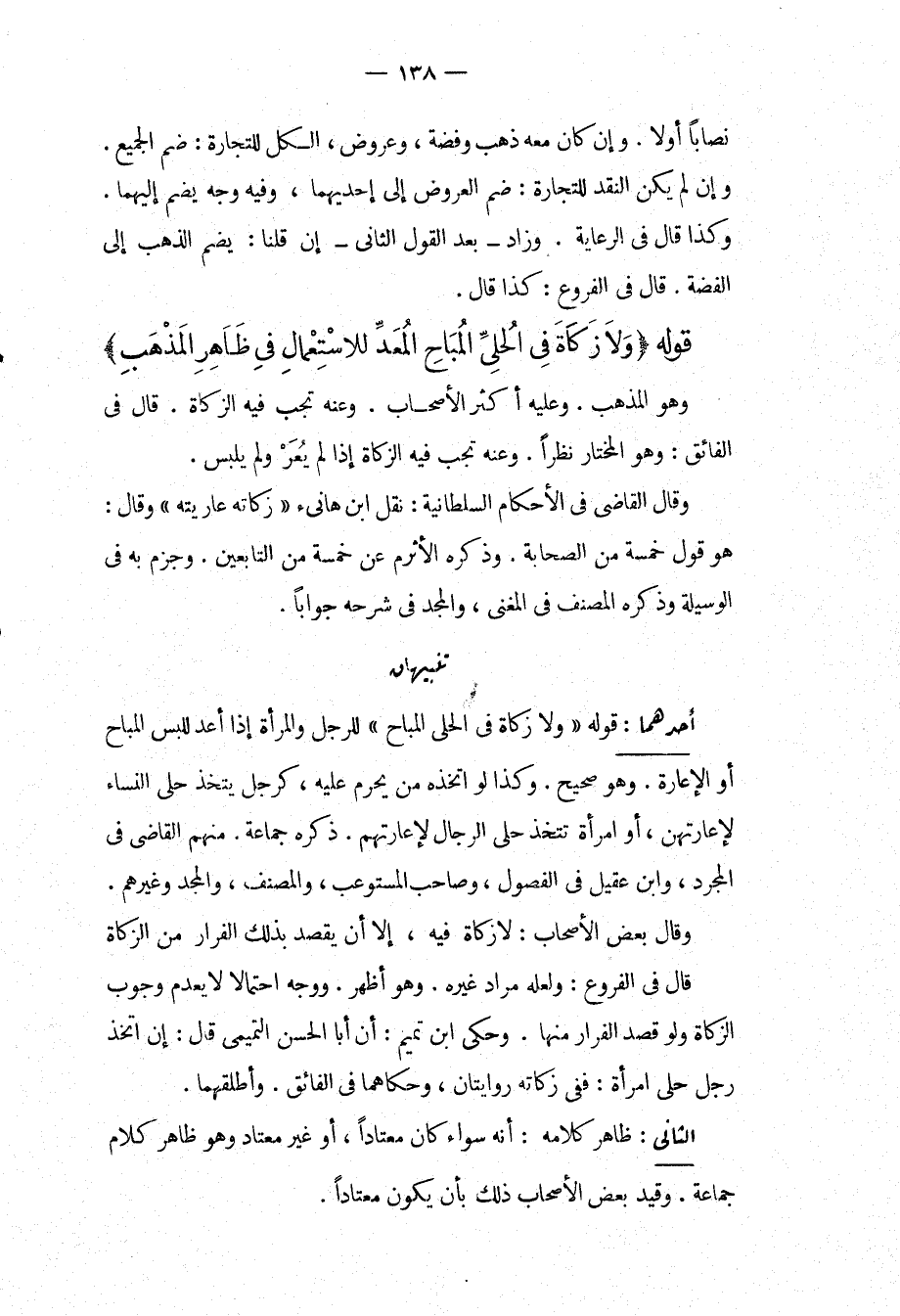 تَنْبِيهَانِ. أَحَدُهُمَا: قَوْلُهُ " وَلَا زَكَاةَ فِي الْحُلِيِّ الْمُبَاحِ " لِلرَّجُلِ وَالْمَرْأَةِ إذَا أُعِدَّ لِلُبْسِ الْمُبَاحِ أَوْ الْإِعَارَةِ. وَهُوَ صَحِيحٌ، وَكَذَا لَوْ اتَّخَذَهُ مَنْ يَحْرُمُ عَلَيْهِ، كَرَجُلٍ يَتَّخِذُ حُلِيَّ النِّسَاءِ لِإِعَارَتِهِنَّ، أَوْ امْرَأَةٍ تَتَّخِذُ حُلِيَّ الرِّجَالِ لِإِعَارَتِهِمْ. ذَكَرَهُ جَمَاعَةٌ. مِنْهُمْ الْقَاضِي فِي الْمُجَرَّدِ، وَابْنُ عَقِيلٍ فِي الْفُصُولِ، وَصَاحِبُ الْمُسْتَوْعِبِ، وَالْمُصَنِّفُ، وَالْمَجْدُ وَغَيْرُهُمْ، وَقَالَ بَعْضُ الْأَصْحَابِ: لَا زَكَاةَ فِيهِ، إلَّا أَنْ يَقْصِدَ بِذَلِكَ الْفِرَارَ مِنْ الزَّكَاةِ قَالَ فِي الْفُرُوعِ: وَلَعَلَّهُ مُرَادُ غَيْرِهِ. وَهُوَ أَظْهَرُ، وَوَجَّهَ احْتِمَالًا لَا يُعْدَمُ وُجُوبُ الزَّكَاةِ وَلَوْ قَصَدَ الْفِرَارَ مِنْهَا، وَحَكَى ابْنُ تَمِيمٍ: أَنَّ أَبَا الْحَسَنِ التَّمِيمِيِّ قَالَ: إنْ اتَّخَذَ رَجُلٌ حُلِيَّ امْرَأَةٍ: فَفِي زَكَاتِهِ رِوَايَتَانِ، وَحَكَاهُمَا فِي الْفَائِقِ، وَأَطْلَقَهُمَا. الثَّانِي: ظَاهِرُ كَلَامِهِ: أَنَّهُ سَوَاءٌ كَانَ مُعْتَادًا، أَوْ غَيْرَ مُعْتَادٍ، وَهُوَ ظَاهِرُ كَلَامِ جَمَاعَةٍ، وَقَيَّدَ بَعْضُ الْأَصْحَابِ ذَلِكَ بِأَنْ يَكُونَ مُعْتَادًا.