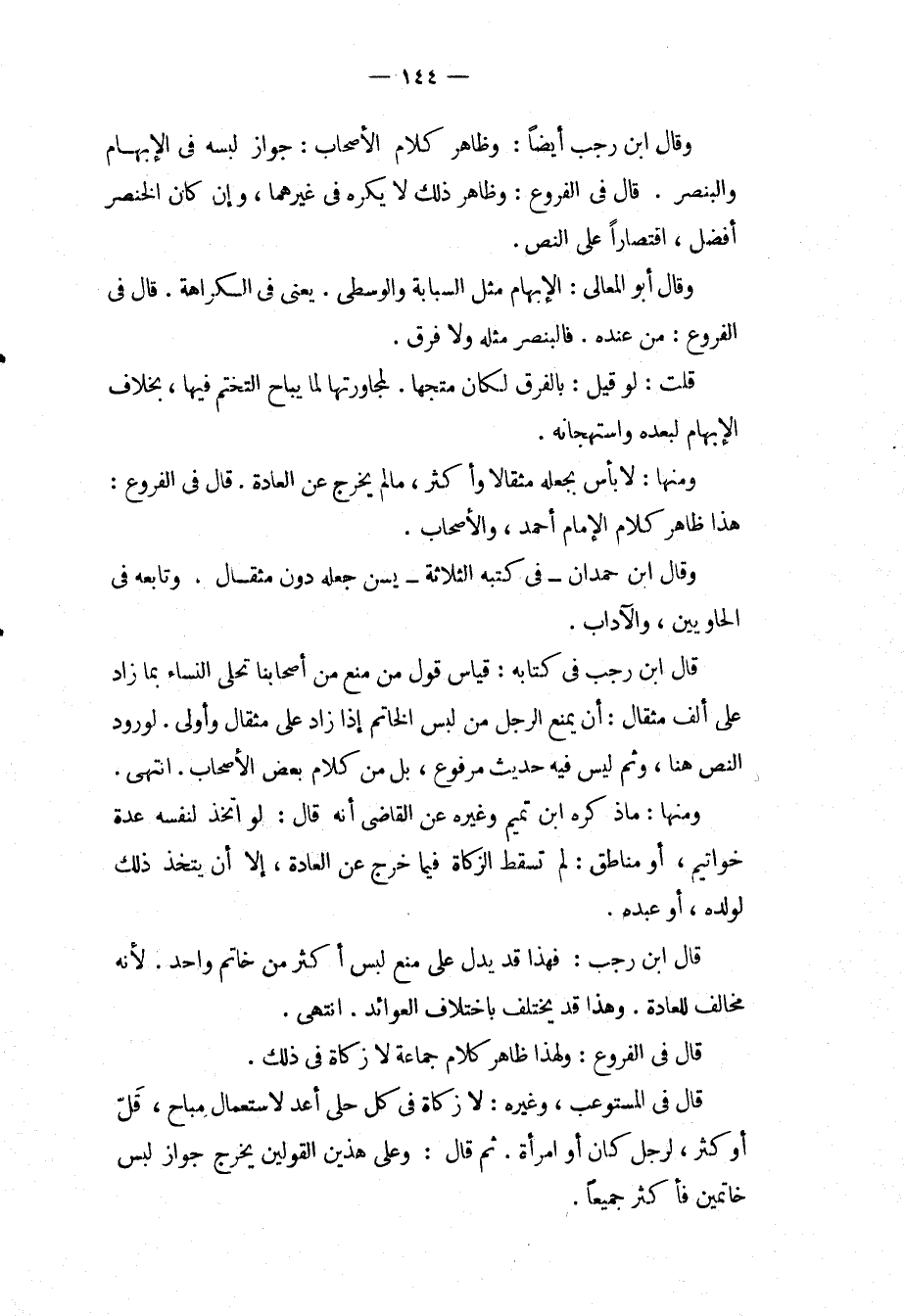 وَمِنْهَا: مَا ذَكَرَهُ ابْنُ تَمِيمٍ وَغَيْرُهُ عَنْ الْقَاضِي أَنَّهُ قَالَ: لَوْ اتَّخَذَ لِنَفْسِهِ عِدَّةَ خَوَاتِيمَ، أَوْ مَنَاطِقَ: لَمْ تَسْقُطْ الزَّكَاةُ فِيمَا خَرَجَ عَنْ الْعَادَةِ، إلَّا أَنْ يَتَّخِذَ ذَلِكَ لِوَلَدِهِ، أَوْ عَبْدِهِ، قَالَ ابْنُ رَجَبٍ: فَهَذَا قَدْ يَدُلُّ عَلَى مَنْع لُبْسِ أَكْثَرِ مِنْ خَاتَمٍ وَاحِدٍ. لِأَنَّهُ مُخَالِفٌ لِلْعَادَةِ، وَهَذَا قَدْ يَخْتَلِفُ بِاخْتِلَافِ الْعَوَائِدِ. انْتَهَى. قَالَ فِي الْفُرُوعِ: وَلِهَذَا ظَاهِرُ كَلَامِ جَمَاعَةٍ لَا زَكَاةَ فِي ذَلِكَ، قَالَ فِي الْمُسْتَوْعِبِ، وَغَيْرِهِ: لَا زَكَاةَ فِي كُلِّ حُلِيٍّ أُعِدَّ لِاسْتِعْمَالٍ مُبَاحٍ، قَلَّ أَوْ كَثُرَ، لِرَجُلٍ كَانَ أَوْ امْرَأَةٍ. ثُمَّ قَالَ: وَعَلَى هَذَيْنِ الْقَوْلَيْنِ يُخَرَّجُ جَوَازُ لُبْسِ خَاتَمَيْنِ فَأَكْثَرَ جَمِيعًا.