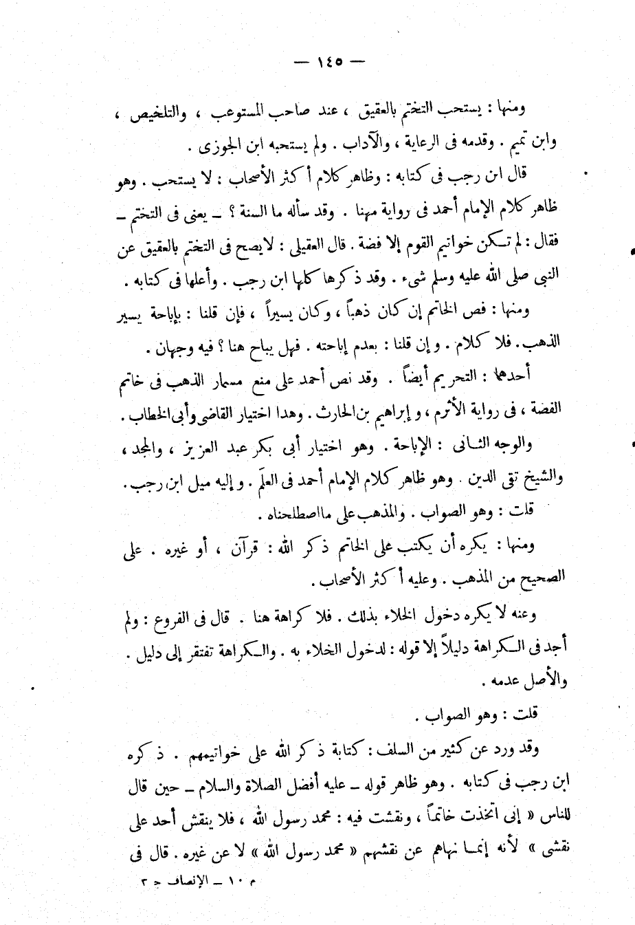 وَمِنْهَا: يُكْرَهُ أَنْ يُكْتَبَ عَلَى الْخَاتَمِ ذِكْرُ اللَّهِ: قُرْآنٌ، أَوْ غَيْرُهُ. عَلَى الصَّحِيحِ مِنْ الْمَذْهَبِ، وَعَلَيْهِ أَكْثَرُ الْأَصْحَابِ، وَعَنْهُ لَا يُكْرَهُ دُخُولُ الْخَلَاءِ بِذَلِكَ، فَلَا كَرَاهَةَ هُنَا. قَالَ فِي الْفُرُوعِ: وَلَمْ أَجِدْ فِي الْكَرَاهَةِ دَلِيلًا إلَّا قَوْلَهُ: لِدُخُولِ الْخَلَاءِ بِهِ، وَالْكَرَاهَةُ تَفْتَقِرُ إلَى دَلِيلٍ. وَالْأَصْلُ عَدَمُهُ. قُلْت: وَهُوَ الصَّوَابُ. وَقَدْ وَرَدَ عَنْ كَثِيرٍ مِنْ السَّلَفِ: كِتَابَةُ ذِكْرِ اللَّهِ عَلَى خَوَاتِيمِهِمْ. ذَكَرَهُ ابْنُ رَجَبٍ فِي كِتَابِهِ، وَهُوَ ظَاهِرُ قَوْلِهِ عَلَيْهِ أَفْضَلُ الصَّلَاةِ وَالسَّلَامِ حِينَ قَالَ لِلنَّاسِ «إنِّي اتَّخَذْت خَاتَمًا، وَنَقَشْت فِيهِ: مُحَمَّدٌ رَسُولُ اللَّهِ، فَلَا يَنْقُشُ أَحَدٌ عَلَى نَقْشِي» لِأَنَّهُ إنَّمَا نَهَاهُمْ عَنْ نَقْشِهِمْ " مُحَمَّدٌ رَسُولُ اللَّهِ " لَا عَنْ غَيْرِهِ. قَالَ فِي