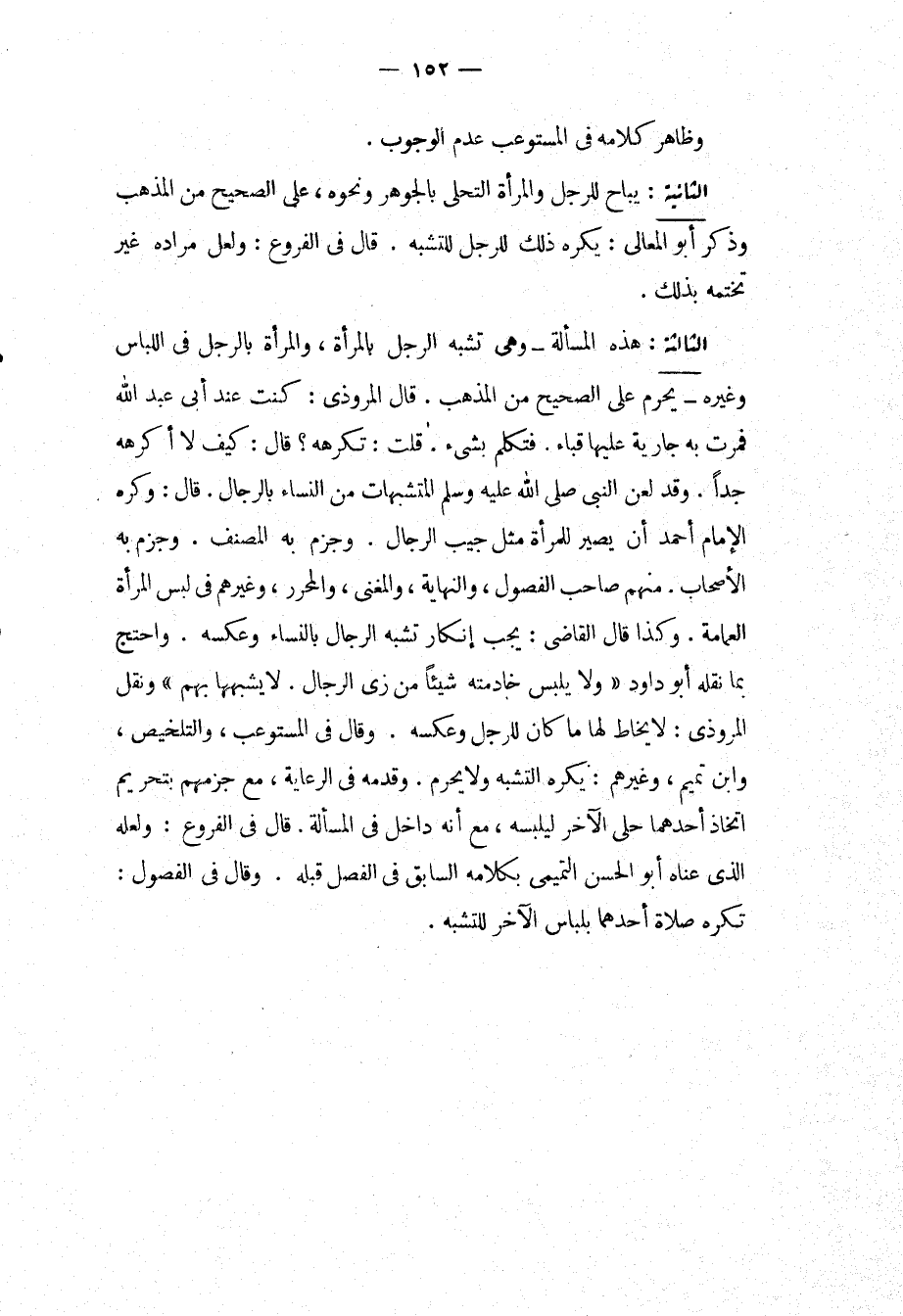 وَظَاهِرُ كَلَامِهِ فِي الْمُسْتَوْعِبِ عَدَمُ الْوُجُوبِ. الثَّانِيَةُ: يُبَاحُ لِلرَّجُلِ وَالْمَرْأَةِ التَّحَلِّي بِالْجَوْهَرِ وَنَحْوِهِ، عَلَى الصَّحِيحِ مِنْ الْمَذْهَبِ وَذَكَرَ أَبُو الْمَعَالِي: يُكْرَهُ ذَلِكَ لِلرَّجُلِ لِلتَّشَبُّهِ. قَالَ فِي الْفُرُوعِ: وَلَعَلَّ مُرَادَهُ غَيْرُ تَخَتُّمِهِ بِذَلِكَ. الثَّالِثَةُ: هَذِهِ الْمَسْأَلَةُ وَهِيَ تَشَبُّهُ الرَّجُلِ بِالْمَرْأَةِ، وَالْمَرْأَةِ بِالرَّجُلِ فِي اللِّبَاسِ وَغَيْرِهِ يَحْرُمُ عَلَى الصَّحِيحِ مِنْ الْمَذْهَبِ. قَالَ الْمَرُّوذِيُّ: كُنْتُ عِنْدَ أَبِي عَبْدِ اللَّهِ فَمَرَّتْ بِهِ جَارِيَةٌ عَلَيْهَا قَبَاءٌ، فَتَكَلَّمَ بِشَيْءٍ. قُلْت: تَكْرَهُهُ؟ قَالَ: كَيْفَ لَا أَكْرَهُهُ جِدًّا. وَقَدْ «لَعَنَ النَّبِيُّ - صَلَّى اللَّهُ عَلَيْهِ وَسَلَّمَ - الْمُتَشَبِّهَاتِ مِنْ النِّسَاءِ بِالرِّجَالِ» . قَالَ: وَكَرِهَ الْإِمَامُ أَحْمَدُ أَنْ يَصِيرَ لِلْمَرْأَةِ مِثْلُ جَيْبِ الرِّجَالِ، وَجَزَمَ بِهِ الْمُصَنِّفُ. وَجَزَمَ بِهِ الْأَصْحَابُ. مِنْهُمْ صَاحِبُ الْفُصُولِ، وَالنِّهَايَةِ، وَالْمُغْنِي، وَالْمُحَرَّرِ، وَغَيْرُهُمْ فِي لُبْسِ الْمَرْأَةِ الْعِمَامَةَ، وَكَذَا قَالَ الْقَاضِي: يَجِبُ إنْكَارُ تَشَبُّهِ الرِّجَالِ بِالنِّسَاءِ وَعَكْسِهِ، وَاحْتَجَّ بِمَا نَقَلَهُ أَبُو دَاوُد " وَلَا يُلْبِسُ خَادِمَتَهُ شَيْئًا مِنْ زِيِّ الرِّجَالِ. لَا يُشَبِّهُهَا بِهِمْ " وَنَقَلَ الْمَرُّوذِيُّ: لَا يُخَاطُ لَهَا مَا كَانَ لِلرَّجُلِ وَعَكْسُهُ، وَقَالَ فِي الْمُسْتَوْعِبِ، وَالتَّلْخِيصِ، وَابْنُ تَمِيمٍ، وَغَيْرُهُمْ: يُكْرَهُ التَّشَبُّهُ وَلَا يَحْرُمُ، وَقَدَّمَهُ فِي الرِّعَايَةِ، مَعَ جَزْمِهِمْ بِتَحْرِيمِ اتِّخَاذِ أَحَدِهِمَا حُلِيَّ الْآخَرِ لِيَلْبَسَهُ، مَعَ أَنَّهُ دَاخِلٌ فِي الْمَسْأَلَةِ. قَالَ فِي الْفُرُوعِ: وَلَعَلَّهُ الَّذِي عَنَاهُ أَبُو الْحَسَنِ التَّمِيمِيُّ بِكَلَامِهِ السَّابِقِ فِي الْفَصْلِ قَبْلَهُ، وَقَالَ فِي الْفُصُولِ: تَكْرَهُ صَلَاةُ أَحَدِهِمَا بِلِبَاسِ الْآخَرِ لِلتَّشَبُّهِ.