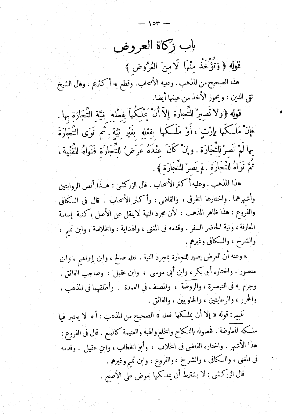 ِ قَوْلُهُ (وَتُؤْخَذُ مِنْهَا لَا مِنْ الْعُرُوضِ) هَذَا الصَّحِيحُ مِنْ الْمَذْهَبِ، وَعَلَيْهِ الْأَصْحَابُ، وَقَطَعَ بِهِ أَكْثَرُهُمْ، وَقَالَ الشَّيْخُ تَقِيُّ الدِّينِ: وَيَجُوزُ الْأَخْذُ مِنْ عَيْنِهَا أَيْضًا. قَوْلُهُ (وَلَا تَصِيرُ لِلتِّجَارَةِ إلَّا أَنْ يَمْلِكَهَا بِفِعْلِهِ بِنِيَّةِ التِّجَارَةِ بِهَا، فَإِنْ مَلَكَهَا بِإِرْثٍ، أَوْ مَلَكَهَا بِفِعْلِهِ بِغَيْرِ نِيَّةٍ. ثُمَّ نَوَى التِّجَارَةَ بِهَا لَمْ تَصِرْ لِلتِّجَارَةِ، وَإِنْ كَانَ عِنْدَهُ عَرَضٌ لِلتِّجَارَةِ فَنَوَاهُ لِلْقِنْيَةِ، ثُمَّ نَوَاهُ لِلتِّجَارَةِ. لَمْ يَصِرْ لِلتِّجَارَةِ) هَذَا الْمَذْهَبُ، وَعَلَيْهِ أَكْثَرُ الْأَصْحَابِ. قَالَ الزَّرْكَشِيُّ: هَذَا أَنَصُّ الرِّوَايَتَيْنِ وَأَشْهَرُهُمَا، وَاخْتَارَهَا الْخِرَقِيُّ، وَالْقَاضِي، وَأَكْثَرُ الْأَصْحَابِ. قَالَ فِي الْكَافِي وَالْفُرُوعِ: هَذَا ظَاهِرُ الْمَذْهَبِ؛ لِأَنَّ مُجَرَّدَ النِّيَّةِ لَا يَنْقُلُ عَنْ الْأَصْلِ، كَنِيَّةِ إسَامَةِ الْمَعْلُوفَةِ، وَنِيَّةِ الْحَاضِرِ لِسَفَرَ، وَقَدَّمَهُ فِي الْمُغْنِي، وَالْهِدَايَةِ، وَالْخُلَاصَةِ، وَابْنُ تَمِيمٍ، وَالشَّرْحِ، وَالْكَافِي وَغَيْرِهِمْ.