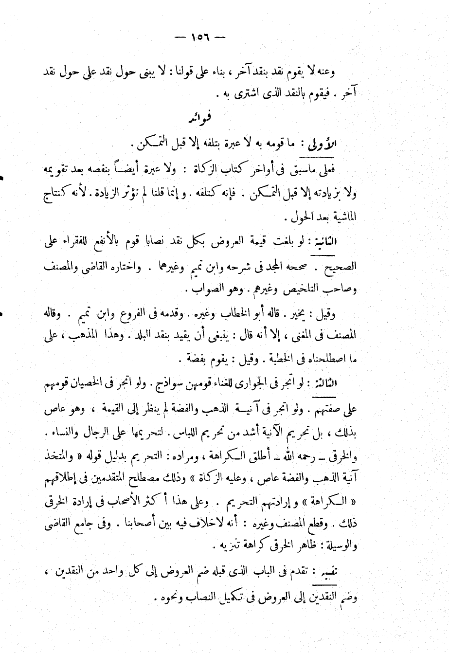 الثَّانِيَةُ: لَوْ بَلَغَتْ قِيمَةُ الْعُرُوضِ بِكُلِّ نَقْدٍ نِصَابًا قُوِّمَ بِالْأَنْفَعِ لِلْفُقَرَاءِ عَلَى الصَّحِيحِ، صَحَّحَهُ الْمَجْدُ فِي شَرْحِهِ وَابْنُ تَمِيمٍ وَغَيْرُهُمَا، وَاخْتَارَهُ الْقَاضِي وَالْمُصَنِّفِ وَصَاحِبُ التَّلْخِيصِ وَغَيْرُهُمْ. وَهُوَ الصَّوَابُ، وَقِيلَ: يُخَيَّرُ. قَالَهُ أَبُو الْخَطَّابِ وَغَيْرُهُ، وَقَدَّمَهُ فِي الْفُرُوعِ وَابْنُ تَمِيمٍ. وَقَالَهُ الْمُصَنِّفُ فِي الْمُغْنِي، إلَّا أَنَّهُ قَالَ: يَنْبَغِي أَنْ يُقَيَّدَ بِنَقْدِ الْبَلَدِ، وَهَذَا الْمَذْهَبُ، عَلَى مَا اصْطَلَحْنَاهُ فِي الْخُطْبَةِ، وَقِيلَ: يُقَوَّمُ بِفِضَّةٍ. الثَّالِثَةُ: لَوْ اتَّجَرَ فِي الْجَوَارِي لِلْغِنَاءِ قَوَّمَهُنَّ سَوَاذِجَ، وَلَوْ اتَّجَرَ فِي الْخُصْيَانِ قَوَّمَهُمْ عَلَى صِفَتِهِمْ، وَلَوْ اتَّجَرَ فِي آنِيَةِ الذَّهَبِ وَالْفِضَّةِ لَمْ يُنْظَرْ إلَى الْقِيمَةِ، وَهُوَ عَاصٍ بِذَلِكَ، بَلْ تَحْرِيمُ الْآنِيَةِ أَشَدُّ مِنْ تَحْرِيمِ اللِّبَاسِ. لِتَحْرِيمِهَا عَلَى الرِّجَالِ وَالنِّسَاءِ. وَالْخِرَقِيُّ - رَحِمَهُ اللَّهُ - أَطْلَقَ الْكَرَاهَةَ، وَمُرَادُهُ: التَّحْرِيمُ بِدَلِيلِ قَوْلِهِ " وَالْمُتَّخِذُ آنِيَةَ الذَّهَبِ وَالْفِضَّةِ عَاصٍ، وَعَلَيْهِ الزَّكَاةُ " وَذَلِكَ مُصْطَلَحُ الْمُتَقَدِّمِينَ فِي إطْلَاقِهِمْ " الْكَرَاهَةَ " وَإِرَادَتِهِمْ التَّحْرِيمَ، وَعَلَى هَذَا أَكْثَرُ الْأَصْحَابِ فِي إرَادَةِ الْخِرَقِيِّ ذَلِكَ، وَقَطَعَ الْمُصَنِّفُ وَغَيْرُهُ: أَنَّهُ لَا خِلَافَ فِيهِ بَيْنَ أَصْحَابِنَا، وَفِي جَامِعِ الْقَاضِي وَالْوَسِيلَةِ: ظَاهِرُ الْخِرَقِيِّ كَرَاهَةُ تَنْزِيهٍ.