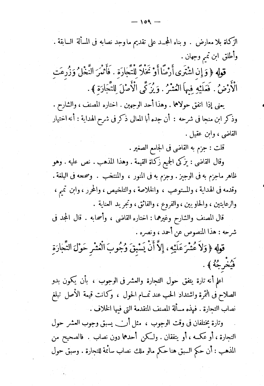 قَوْلُهُ (وَإِنْ اشْتَرَى أَرْضًا أَوْ نَخْلًا لِلتِّجَارَةِ، فَأَثْمَرَ النَّخْلُ وَزُرِعَتْ الْأَرْضُ، فَعَلَيْهِ الْعُشْرُ، وَيُزَكِّي الْأَصْلَ لِلتِّجَارَةِ) . يَعْنِي إذَا اتَّفَقَ حَوْلَاهُمَا، وَهَذَا أَحَدُ الْوَجْهَيْنِ، اخْتَارَهُ الْمُصَنِّفُ، وَالشَّارِحُ، وَذَكَرَ ابْنُ مُنَجَّى فِي شَرْحِهِ: أَنَّ جَدَّهُ أَبَا الْمَعَالِي ذَكَرَ فِي شَرْحِ الْهِدَايَةِ: أَنَّهُ اخْتِيَارُ الْقَاضِي، وَابْنِ عَقِيلٍ. قُلْت: جَزَمَ بِهِ الْقَاضِي فِي الْجَامِعِ الصَّغِيرِ، وَقَالَ الْقَاضِي: يُزَكِّي الْجَمِيعَ زَكَاةَ الْقِيمَةِ، وَهَذَا الْمَذْهَبُ، نَصَّ عَلَيْهِ، وَهُوَ ظَاهِرُ مَا جَزَمَ بِهِ فِي الْوَجِيزِ، وَجَزَمَ بِهِ فِي الْمُنَوِّرِ، وَالْمُنْتَخَبِ، وَصَحَّحَهُ فِي الْبُلْغَةِ، وَقَدَّمَهُ فِي الْهِدَايَةِ، وَالْمُسْتَوْعِبِ، وَالْخُلَاصَةِ، وَالتَّلْخِيصِ، وَالْمُحَرَّرِ، وَابْنُ تَمِيمٍ، وَالرِّعَايَتَيْنِ، وَالْحَاوِيَيْنِ، وَالْفُرُوعِ، وَالْفَائِقِ، وَتَجْرِيدِ الْعِنَايَةِ. قَالَ الْمُصَنِّفُ وَالشَّارِحُ وَغَيْرُهُمَا: اخْتَارَهُ الْقَاضِي، وَأَصْحَابُهُ. قَالَ الْمَجْدُ فِي شَرْحِهِ: هَذَا الْمَنْصُوصُ عَنْ أَحْمَدَ، وَنَصَرَهُ. قَوْلُهُ (وَلَا عُشْرَ عَلَيْهِ، إلَّا أَنْ يَسْبِقَ وُجُوبُ الْعُشْرِ حَوْلَ التِّجَارَةِ فَيُخْرِجُهُ) . اعْلَمْ أَنَّهُ تَارَةً يَتَّفِقُ حَوْلُ التِّجَارَةِ وَالْعُشْرِ فِي الْوُجُوبِ، بِأَنْ يَكُونَ بُدُوُّ الصَّلَاحِ فِي الثَّمَرَةِ وَاشْتِدَادُ الْحَبِّ عِنْدَ تَمَامِ الْحَوْلِ، وَكَانَتْ قِيمَةُ الْأَصْلِ تَبْلُغُ نِصَابَ التِّجَارَةِ، فَهَذِهِ مَسْأَلَةُ الْمُصَنِّفِ الْمُتَقَدِّمَةِ الَّتِي فِيهَا الْخِلَافُ، وَتَارَةً يَخْتَلِفَانِ فِي وَقْتِ الْوُجُوبِ، مِثْلَ أَنْ يَسْبِقَ وُجُوبُ الْعُشْرِ حَوْلَ التِّجَارَةِ، أَوْ عَكْسِهِ، أَوْ يَتَّفِقَانِ، وَلَكِنَّ أَحَدَهُمَا دُونَ نِصَابٍ، فَالصَّحِيحُ مِنْ الْمَذْهَبِ: أَنَّ حُكْمَ السَّبْقِ هُنَا حُكْمُ مَا لَوْ مَلَكَ نِصَابَ سَائِمَةٍ لِلتِّجَارَةِ، وَسَبَقَ حَوْلُ