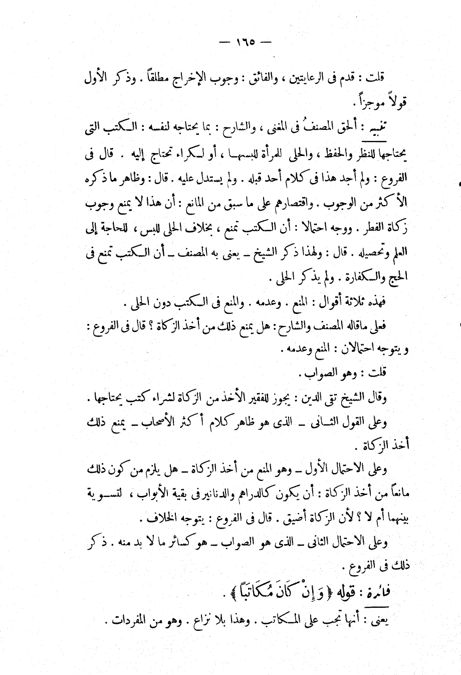 قُلْت: وَهُوَ الصَّوَابُ، وَقَالَا الشَّيْخُ تَقِيُّ الدِّينِ: يَجُوزُ لِلْفَقِيرِ الْأَخْذُ مِنْ الزَّكَاةِ لِشِرَاءِ كُتُبٍ يَحْتَاجُهَا، وَعَلَى الْقَوْلِ الثَّانِي الَّذِي هُوَ ظَاهِرُ كَلَامِ أَكْثَرِ الْأَصْحَابِ يَمْنَعُ ذَلِكَ أَخْذَ الزَّكَاةِ، وَعَلَى الِاحْتِمَالِ الْأَوَّلِ وَهُوَ الْمَنْعُ مِنْ أَخْذِ الزَّكَاةِ هَلْ يَلْزَمُ مِنْ كَوْنِ ذَلِكَ مَانِعًا مِنْ أَخْذِ الزَّكَاةِ: أَنْ يَكُونَ كَالدَّرَاهِمِ وَالدَّنَانِيرِ فِي بَقِيَّةِ الْأَبْوَابِ، لِتَسْوِيَةٍ بَيْنَهُمَا أَمْ لَا؟ لِأَنَّ الزَّكَاةَ أَضْيَقُ. قَالَ فِي الْفُرُوعِ: يَتَوَجَّهُ الْخِلَافُ، وَعَلَى الِاحْتِمَالِ الثَّانِي الَّذِي هُوَ الصَّوَابُ هُوَ كَسَائِرِ مَا لَا بُدَّ مِنْهُ. ذَكَرَ ذَلِكَ فِي الْفُرُوعِ.