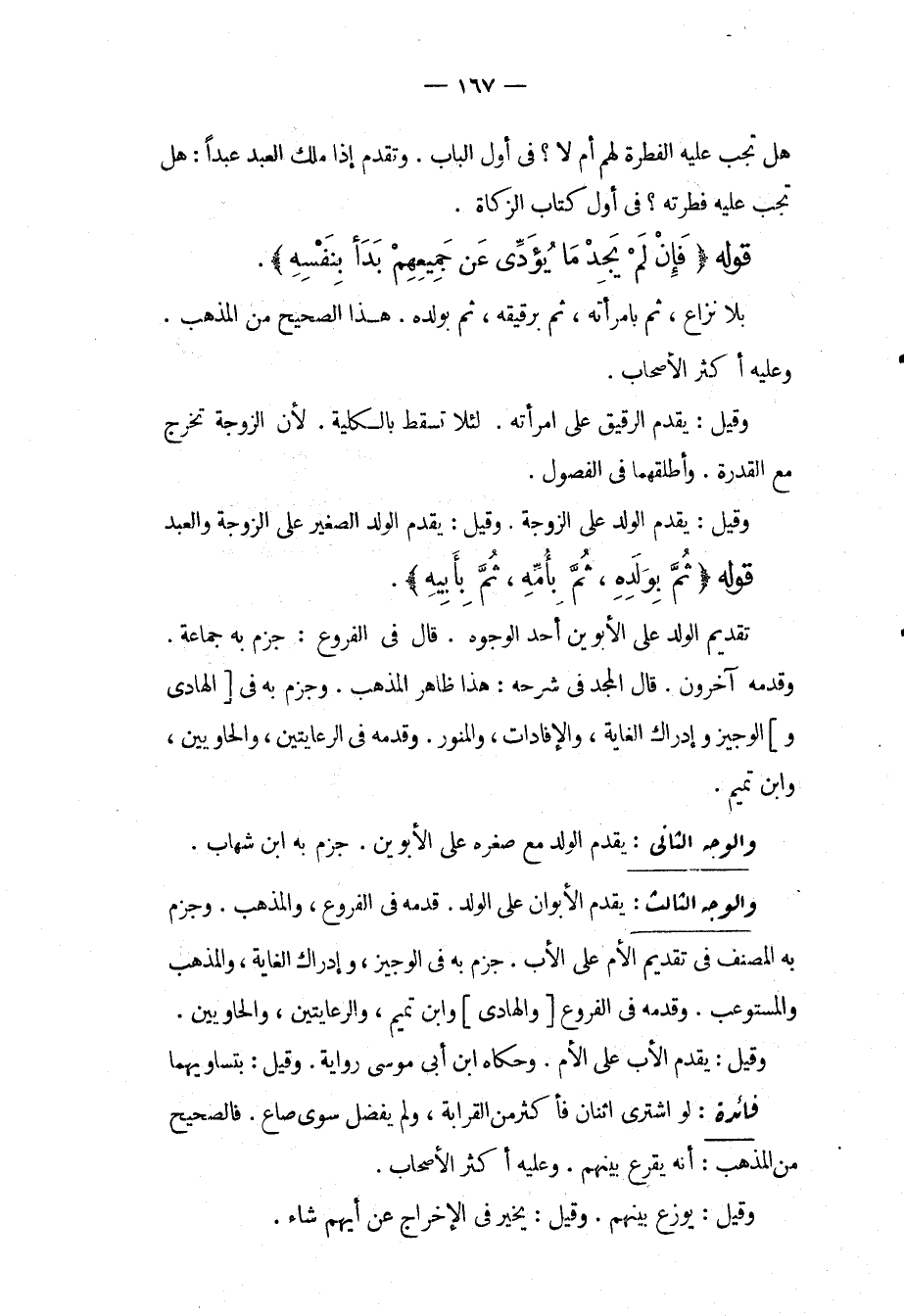 قَوْلُهُ (فَإِنْ لَمْ يَجِدْ مَا يُؤَدِّي عَنْ جَمِيعِهِ بَدَأَ بِنَفْسِهِ) بِلَا نِزَاعٍ، ثُمَّ بِامْرَأَتِهِ، ثُمَّ بِرَقِيقِهِ، ثُمَّ بِوَلَدِهِ. هَذَا الصَّحِيحُ مِنْ الْمَذْهَبِ، وَعَلَيْهِ أَكْثَرُ الْأَصْحَابِ، وَقِيلَ: يُقَدِّمُ الرَّقِيقَ عَلَى امْرَأَتِهِ. لِئَلَّا تَسْقُطَ بِالْكُلِّيَّةِ، لِأَنَّ الزَّوْجَةَ تُخْرِجُ مَعَ الْقُدْرَةِ، وَأَطْلَقَهُمَا فِي الْفُصُولِ، وَقِيلَ: يُقَدِّمُ الْوَلَدَ عَلَى الزَّوْجَةِ، وَقِيلَ: يُقَدِّمُ الْوَلَدَ الصَّغِيرَ عَلَى الزَّوْجَةِ وَالْعَبْدِ قَوْلُهُ (ثُمَّ بِوَلَدِهِ، ثُمَّ بِأُمِّهِ، ثُمَّ بِأَبِيهِ) تَقْدِيمُ الْوَلَدِ عَلَى الْأَبَوَيْنِ أَحَدُ الْوُجُوهِ. قَالَ فِي الْفُرُوعِ: جَزَمَ بِهِ جَمَاعَةٌ، وَقَدَّمَهُ آخَرُونَ. قَالَ الْمَجْدُ فِي شَرْحِهِ: هَذَا ظَاهِرُ الْمَذْهَبِ، وَجَزَمَ بِهِ فِي [الْهَادِي] وَالْوَجِيزِ وَإِدْرَاكِ الْغَايَةِ، وَالْإِفَادَاتِ، وَالْمُنَوِّرِ، وَقَدَّمَهُ فِي الرِّعَايَتَيْنِ، وَالْحَاوِيَيْنِ، وَابْنُ تَمِيمٍ، وَالْوَجْهُ الثَّانِي: يُقَدَّمُ الْوَلَدُ مَعَ صِغَرِهِ عَلَى الْأَبَوَيْنِ، جَزَمَ بِهِ ابْنُ شِهَابٍ، وَالْوَجْهُ الثَّالِثُ: يُقَدَّمُ الْأَبَوَانِ عَلَى الْوَلَدِ، قَدَّمَهُ فِي الْفُرُوعِ، وَالْمُذْهَبِ، وَجَزَمَ بِهِ الْمُصَنِّفُ فِي تَقْدِيمِ الْأُمِّ عَلَى الْأَبِ، جَزَمَ بِهِ فِي الْوَجِيزِ، وَإِدْرَاكِ الْغَايَةِ، وَالْمُذْهَبِ وَالْمُسْتَوْعِبِ، وَقَدَّمَهُ فِي الْفُرُوعِ [وَالْهَادِي] وَابْنُ تَمِيمٍ، وَالرِّعَايَتَيْنِ، وَالْحَاوِيَيْنِ، وَقِيلَ: يُقَدَّمُ الْأَبُ عَلَى الْأُمِّ، وَحَكَاهُ ابْنُ أَبِي مُوسَى رِوَايَةً. وَقِيلَ: بِتَسَاوِيهِمَا فَائِدَةٌ: لَوْ اشْتَرَى اثْنَانِ فَأَكْثَرُ مِنْ الْقَرَابَةِ، وَلَمْ يَفْضُلْ سِوَى صَاعٍ فَالصَّحِيحُ مِنْ الْمَذْهَبِ: أَنَّهُ يُقْرِعُ بَيْنَهُمْ. وَعَلَيْهِ أَكْثَرُ الْأَصْحَابِ، وَقِيلَ: يُوَزِّعُ بَيْنَهُمْ، وَقِيلَ: يُخَيَّرُ فِي الْإِخْرَاجِ عَنْ أَيِّهِمْ شَاءَ.
