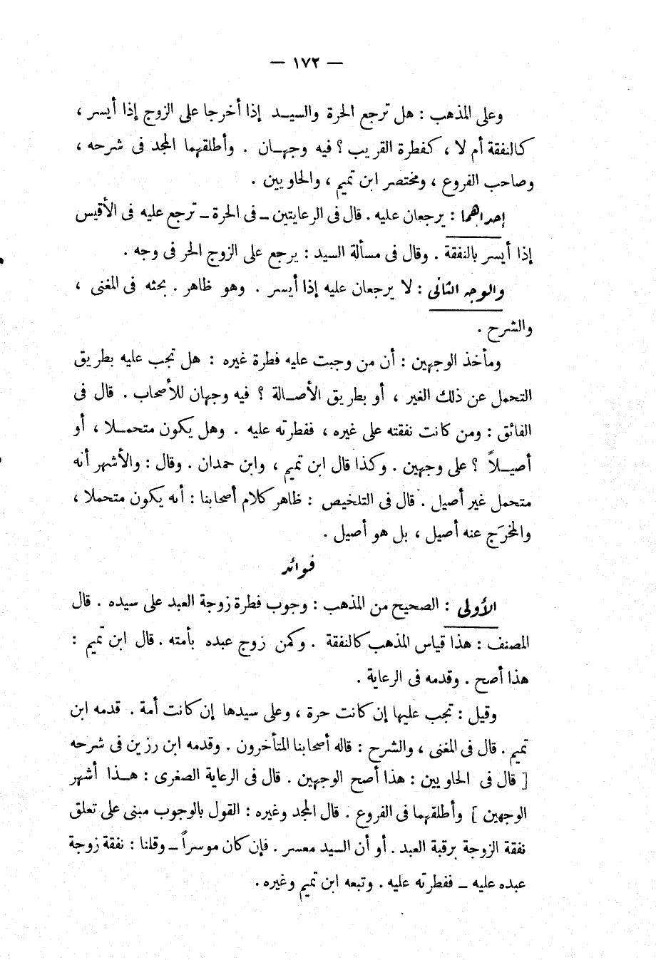 فَوَائِدُ. الْأُولَى: الصَّحِيحُ مِنْ الْمَذْهَبِ: وُجُوبُ فِطْرَةِ زَوْجَةِ الْعَبْدِ عَلَى سَيِّدِهِ. قَالَ الْمُصَنِّفُ: هَذَا قِيَاسُ الْمَذْهَبِ كَالنَّفَقَةِ، وَكَمَنْ زَوَّجَ عَبْدَهُ بِأَمَتِهِ. قَالَ ابْنُ تَمِيمٍ: هَذَا أَصَحُّ، وَقَدَّمَهُ فِي الرِّعَايَةِ، وَقِيلَ: تَجِبُ عَلَيْهَا إنْ كَانَتْ حُرَّةً، وَعَلَى سَيِّدِهَا إنْ كَانَتْ أَمَةً، قَدَّمَهُ ابْنُ تَمِيمٍ. قَالَ فِي الْمُغْنِي، وَالشَّرْحِ: قَالَهُ أَصْحَابُنَا الْمُتَأَخِّرُونَ، وَقَدَّمَهُ ابْنُ رَزِينٍ فِي شَرْحِهِ [قَالَ فِي الْحَاوِيَيْنِ: هَذَا أَصَحّ الْوَجْهَيْنِ. قَالَ فِي الرِّعَايَةِ الصُّغْرَى: هَذَا أَشْهَرُ الْوَجْهَيْنِ] وَأَطْلَقَهُمَا فِي الْفُرُوعِ. قَالَ الْمَجْدُ وَغَيْرُهُ: الْقَوْلُ بِالْوُجُوبِ مَبْنِيٌّ عَلَى تَعَلُّقِ نَفَقَةِ الزَّوْجَةِ بِرَقَبَةِ الْعَبْدِ. أَوْ أَنَّ السَّيِّدَ مُعْسِرٌ، فَإِنْ كَانَ مُوسِرًا وَقُلْنَا: نَفَقَةُ زَوْجَةِ عَبْدِهِ عَلَيْهِ فَفِطْرَتُهُ عَلَيْهِ، وَتَبِعَهُ ابْنُ تَمِيمٍ وَغَيْرُهُ.
