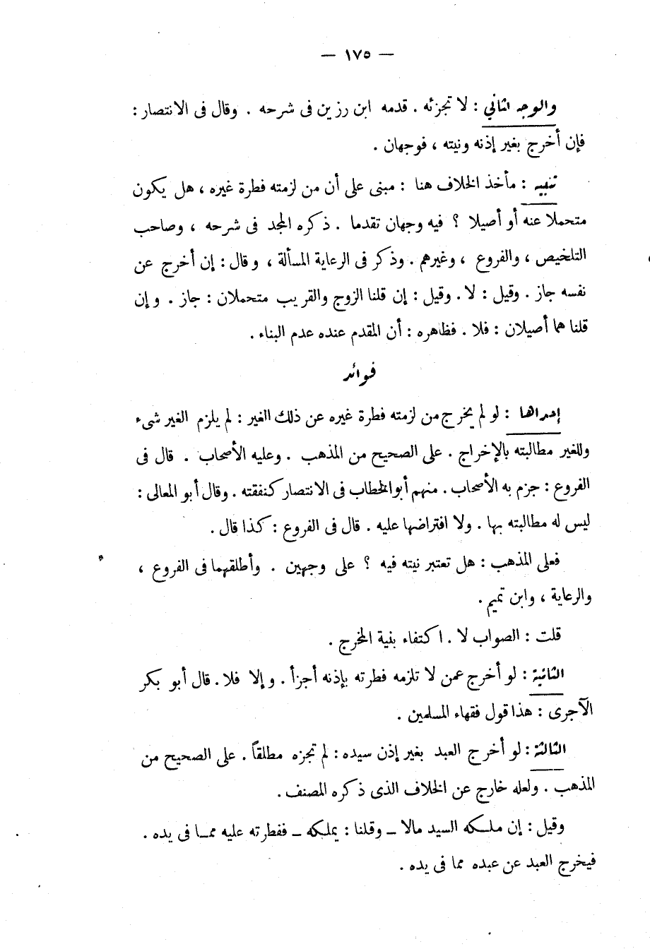 قُلْت: الصَّوَابُ لَا، اكْتِفَاءً بِنِيَّةِ الْمُخْرِجِ. الثَّانِيَةُ: لَوْ أَخْرَجَ عَمَّنْ لَا تَلْزَمُهُ فِطْرَتُهُ بِإِذْنِهِ أَجْزَأَ، وَإِلَّا فَلَا. قَالَ أَبُو بَكْرٍ الْآجُرِّيُّ: هَذَا قَوْلُ فُقَهَاءِ الْمُسْلِمِينَ. الثَّالِثَةُ: لَوْ أَخْرَجَ الْعَبْدُ بِغَيْرِ إذْنِ سَيِّدِهِ: لَمْ تُجْزِهِ مُطْلَقًا. عَلَى الصَّحِيحِ مِنْ الْمَذْهَبِ، وَلَعَلَّهُ خَارِجٌ عَنْ الْخِلَافِ الَّذِي ذَكَرَهُ الْمُصَنِّفُ، وَقِيلَ: إنْ مَلَّكَهُ السَّيِّدُ مَالًا وَقُلْنَا: يَمْلِكُهُ فَفِطْرَتُهُ عَلَيْهِ مِمَّا فِي يَدِهِ، فَيُخْرِجُ الْعَبْدُ عَنْ عَبْدِهِ مِمَّا فِي يَدِهِ.