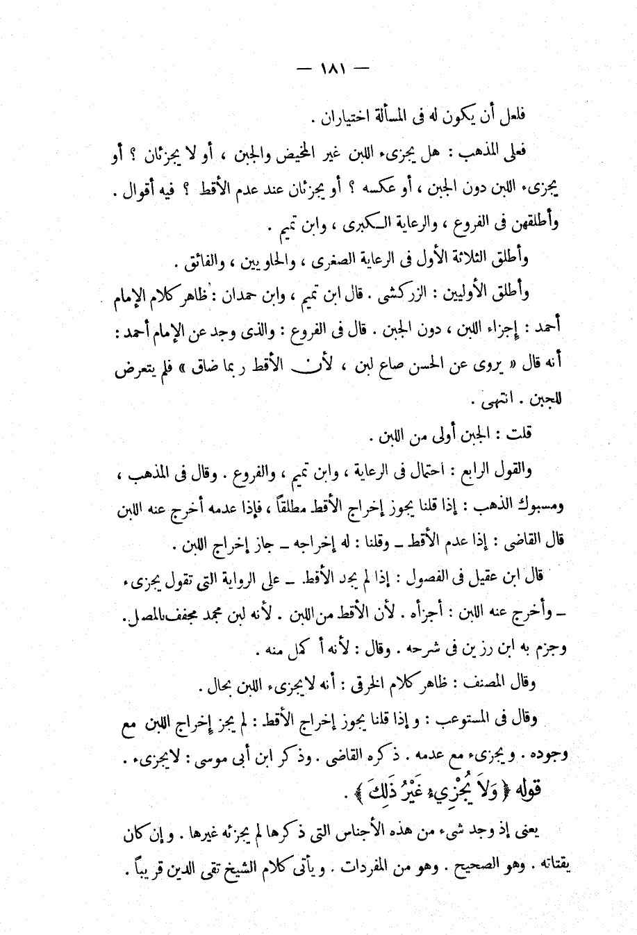 فَلَعَلَّ أَنْ يَكُونَ لَهُ فِي الْمَسْأَلَةِ اخْتِيَارَانِ، فَعَلَى الْمَذْهَبِ: هَلْ يُجْزِئُ اللَّبَنُ غَيْرُ الْمَخِيضِ وَالْجُبْنُ، أَوْ لَا يُجْزِئَانِ؟ أَوْ يُجْزِئُ اللَّبَنُ دُونَ الْجُبْنِ، أَوْ عَكْسُهُ؟ أَوْ يُجْزِئَانِ عِنْدَ عَدَمِ الْأَقِطِ؟ فِيهِ أَقْوَالٌ، وَأَطْلَقَهُنَّ فِي الْفُرُوعِ، وَالرِّعَايَةِ الْكُبْرَى، وَابْنُ تَمِيمٍ، وَأَطْلَقَ الثَّلَاثَةَ الْأُوَلَ فِي الرِّعَايَةِ الصُّغْرَى، وَالْحَاوِيَيْنِ، وَالْفَائِقِ، وَأَطْلَقَ الْأُولَيَيْنِ: الزَّرْكَشِيُّ. قَالَ ابْنُ تَمِيمٍ، وَابْنُ حَمْدَانَ: ظَاهِرُ كَلَامِ الْإِمَامِ أَحْمَدَ: إجْزَاءُ اللَّبَنِ، دُونَ الْجُبْنِ. قَالَ فِي الْفُرُوعِ: وَاَلَّذِي وُجِدَ عَنْ الْإِمَامِ أَحْمَدَ: أَنَّهُ قَالَ " يُرْوَى عَنْ الْحَسَنِ صَاعُ لَبَنٍ؛ لِأَنَّ الْأَقِطَ رُبَّمَا ضَاقَ " فَلَمْ يَتَعَرَّضْ لِلْجُبْنِ. انْتَهَى.