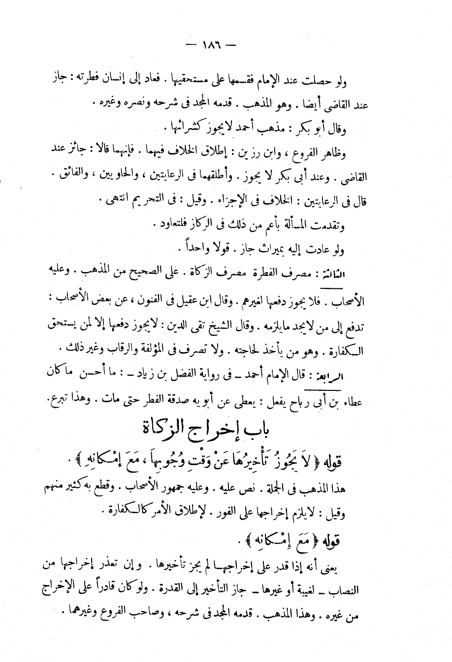 ِ قَوْلُهُ (لَا يَجُوزُ تَأْخِيرُهَا عَنْ وَقْتِ وُجُوبِهَا، مَعَ إمْكَانِهِ) هَذَا الْمَذْهَبُ فِي الْجُمْلَةِ، نَصَّ عَلَيْهِ، وَعَلَيْهِ جُمْهُورُ الْأَصْحَابِ، وَقَطَعَ بِهِ كَثِيرٌ مِنْهُمْ، وَقِيلَ: لَا يَلْزَمُ إخْرَاجُهَا عَلَى الْفَوْرِ. لِإِطْلَاقِ الْأَمْرِ كَالْكَفَّارَةِ.