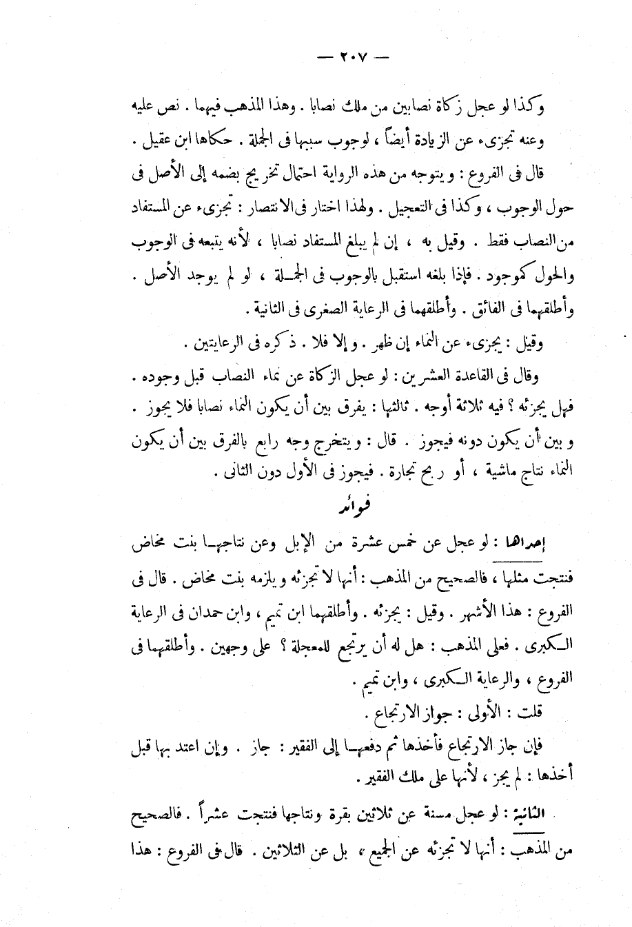 وَقَالَ فِي الْقَاعِدَةِ الْعِشْرِينَ: لَوْ عَجَّلَ الزَّكَاةَ عَنْ نَمَاءِ النِّصَابِ قَبْلَ وُجُودِهِ، فَهَلْ يُجْزِئُهُ؟ فِيهِ ثَلَاثَةُ أَوْجُهٍ. ثَالِثُهَا: يُفَرَّقُ بَيْنَ أَنْ يَكُونَ النَّمَاءُ نِصَابًا فَلَا يَجُوزُ، وَبَيْنَ أَنْ يَكُونَ دُونَهُ فَيَجُوزُ. قَالَ: وَيَتَخَرَّجُ وَجْهٌ رَابِعٌ بِالْفَرْقِ بَيْنَ أَنْ يَكُونَ النَّمَاءُ نِتَاجَ مَاشِيَةٍ، أَوْ رِبْحَ تِجَارَةٍ، فَيَجُوزُ فِي الْأَوَّلِ دُونَ الثَّانِي.