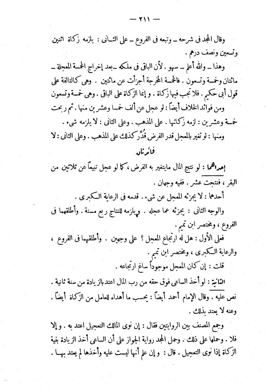 وَقَالَ الْمَجْدُ فِي شَرْحِهِ وَتَبِعَهُ فِي الْفُرُوعِ عَلَى الثَّانِي: يَلْزَمُهُ زَكَاةُ اثْنَيْنِ وَتِسْعِينَ وَنِصْفِ دِرْهَمٍ، وَهَذَا وَاَللَّهُ أَعْلَمُ سَهْوٌ؛ لِأَنَّ الْبَاقِيَ فِي مِلْكِهِ بَعْدَ إخْرَاجِ الْخَمْسَةِ الْمُعَجَّلَةِ مِائَتَانِ وَخَمْسَةٌ وَتِسْعُونَ، فَالْخَمْسَةُ الْمُخْرَجَةُ أَجْزَأَتْ عَنْ مِائَتَيْنِ، وَهِيَ كَالتَّالِفَةِ عَلَى قَوْلِ أَبِي حَكِيمٍ، فَلَا تَجِبُ فِيهَا زَكَاةٌ، وَإِنَّمَا الزَّكَاةُ عَلَى الْبَاقِي، وَهِيَ خَمْسَةٌ وَتِسْعُونَ وَمِنْ فَوَائِدِ الْخِلَافِ أَيْضًا: لَوْ عَجَّلَ عَنْ أَلْفٍ خَمْسًا وَعِشْرِينَ مِنْهَا. ثُمَّ رَبِحَتْ خَمْسَةً وَعِشْرِينَ: لَزِمَهُ زَكَاتُهَا. عَلَى الْمَذْهَبِ، وَعَلَى الثَّانِي: لَا يَلْزَمُهُ شَيْءٌ، وَمِنْهَا: لَوْ تَغَيَّرَ بِالْمُعَجَّلِ قَدْرُ الْفَرْضِ قُدِّرَ كَذَلِكَ عَلَى الْمَذْهَبِ، وَعَلَى الثَّانِي: لَا