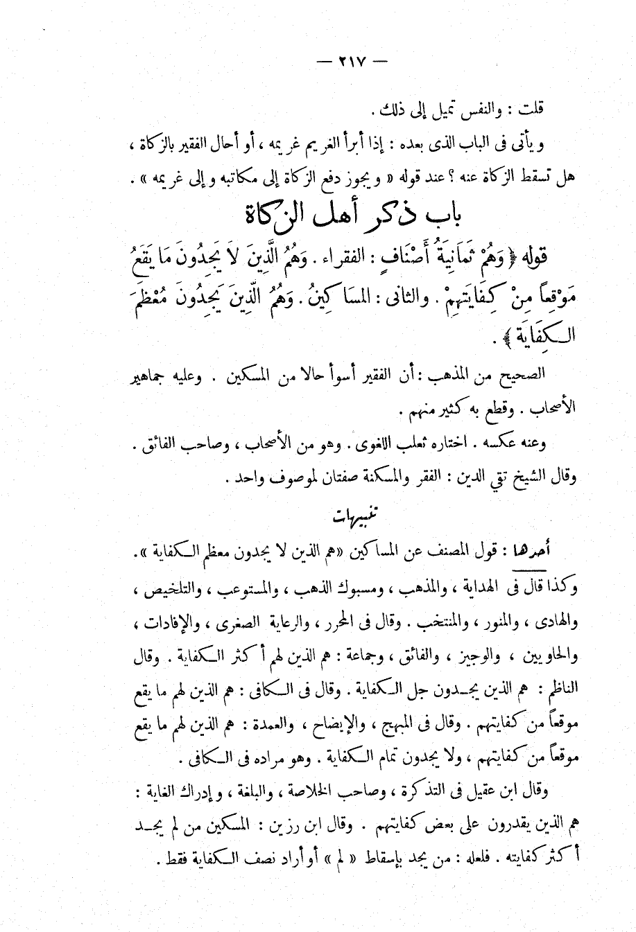ِ قَوْلُهُ (وَهُمْ ثَمَانِيَةُ أَصْنَافٍ: الْفُقَرَاءُ، وَهُمْ الَّذِينَ لَا يَجِدُونَ مَا يَقَعُ مَوْقِعًا مِنْ كِفَايَتِهِمْ، وَالثَّانِي: الْمَسَاكِينُ، وَهُمْ الَّذِينَ لَا يَجِدُونَ مُعْظَمَ الْكِفَايَةِ) ، الصَّحِيحُ مِنْ الْمَذْهَبِ: أَنَّ الْفَقِيرَ أَسْوَأُ حَالًا مِنْ الْمِسْكِينِ، وَعَلَيْهِ جَمَاهِيرُ الْأَصْحَابِ، وَقَطَعَ بِهِ كَثِيرٌ مِنْهُمْ، وَعَنْهُ عَكْسُهُ. اخْتَارَهُ ثَعْلَبٌ اللُّغَوِيُّ، وَهُوَ مِنْ الْأَصْحَابِ، وَصَاحِبُ الْفَائِقِ، وَقَالَ الشَّيْخُ تَقِيُّ الدِّينِ: الْفَقْرُ وَالْمَسْكَنَةُ صِفَتَانِ لِمَوْصُوفٍ وَاحِدٍ.