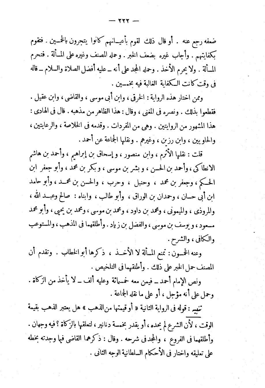 ضَعْفُهُ رَجَعَ عَنْهُ. أَوْ قَالَ ذَلِكَ لِقَوْمٍ بِأَعْيَانِهِمْ كَانُوا يَتَّجِرُونَ بِالْخَمْسِينَ، فَتَقُومُ بِكِفَايَتِهِمْ، وَأَجَابَ غَيْرُهُ بِضَعْفِ الْخَبَرِ، وَحَمَلَهُ الْمُصَنِّفُ وَغَيْرُهُ عَلَى الْمَسْأَلَةِ، فَتَحْرُمُ الْمَسْأَلَةُ، وَلَا يَحْرُمُ الْأَخْذُ، وَحَمَلَهُ الْمَجْدُ عَلَى أَنَّهُ عَلَيْهِ أَفْضَلُ الصَّلَاةِ وَالسَّلَامِ قَالَهُ فِي وَقْتٍ كَانَتْ الْكِفَايَةُ الْغَالِبَةُ فِيهِ بِخَمْسِينَ، وَمِمَّنْ اخْتَارَ هَذِهِ الرِّوَايَةَ: الْخِرَقِيُّ، وَابْنُ أَبِي مُوسَى، وَالْقَاضِي، وَابْنُ عَقِيلٍ، فَقَطَعُوا بِذَلِكَ، وَنَصَرَهُ فِي الْمُغْنِي، وَقَالَ: هَذَا الظَّاهِرُ مِنْ مَذْهَبِهِ. قَالَ فِي الْهَادِي: هَذَا الْمَشْهُورُ مِنْ الرِّوَايَتَيْنِ، وَهِيَ مِنْ الْمُفْرَدَاتِ، وَقَدَّمَهُ فِي الْخُلَاصَةِ، وَالرِّعَايَتَيْنِ، وَالْحَاوِيَيْنِ، وَابْنُ رَزِينٍ، وَغَيْرُهُمْ، وَنَقَلَهَا الْجَمَاعَةُ عَنْ أَحْمَدَ، قُلْت: نَقَلَهَا الْأَثْرَمُ، وَابْنُ مَنْصُورٍ، وَإِسْحَاقُ بْنُ إبْرَاهِيمَ، وَأَحْمَدُ بْنُ هَاشِمٍ الْأَنْطَاكِيُّ، وَأَحْمَدُ بْنُ الْحَسَنِ، وَبِشْرُ بْنُ مُوسَى، وَبَكْرُ بْنُ مُحَمَّدٍ، وَأَبُو جَعْفَرِ بْنِ الْحَكَمِ، وَجَعْفَرُ بْنُ مُحَمَّدٍ، وَحَنْبَلٌ، وَحَرْبٌ، وَالْحَسَنُ بْنُ مُحَمَّدٍ، وَأَبُو حَامِدِ بْنِ أَبِي حَسَّانٍ، وَحَمْدَانُ بْنُ الْوَرَّاقِ، وَأَبُو طَالِبٍ، وَابْنَاهُ: صَالِحٌ وَعَبْدُ اللَّهِ، وَالْمَرُّوذِيُّ، وَالْمَيْمُونِيُّ، وَمُحَمَّدُ بْنُ دَاوُد، وَمُحَمَّدُ بْنُ مُوسَى، وَمُحَمَّدُ بْنُ يَحْيَى، وَأَبُو مُحَمَّدٍ مَسْعُودٌ، وَيُوسُفُ بْنُ مُوسَى، وَالْفَضْلُ بْنُ زِيَادٍ، وَأَطْلَقَهُمَا فِي الْمُذْهَبِ، وَالْمُسْتَوْعِبِ وَالْكَافِي، وَالشَّرْحِ، وَعَنْهُ الْخَمْسُونَ: تَمْنَعُ الْمَسْأَلَةَ لَا الْأَخْذَ، ذَكَرَهَا أَبُو الْخَطَّابِ، وَتَقَدَّمَ أَنَّ الْمُصَنِّفَ حَمَلَ الْخَبَرَ عَلَى ذَلِكَ، وَأَطْلَقَهُمَا فِي التَّلْخِيصِ، وَنَصَّ الْإِمَامُ أَحْمَدُ فِيمَنْ مَعَهُ خَمْسُمِائَةٍ وَعَلَيْهِ أَلْفٌ لَا يَأْخُذُ مِنْ الزَّكَاةِ، وَحُمِلَ عَلَى أَنَّهُ مُؤَجَّلٌ، أَوْ عَلَى مَا نَقَلَهُ الْجَمَاعَةُ.