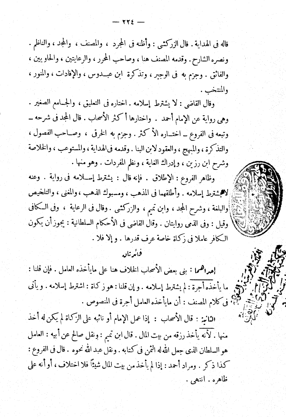 قَالَهُ فِي الْهِدَايَةِ. قَالَ الزَّرْكَشِيُّ: وَأَظُنُّهُ فِي الْمُجَرَّدِ، وَالْمُصَنِّفُ، وَالْمَجْدُ، وَالنَّاظِمُ، وَنَصَرَهُ الشَّارِحُ، وَقَدَّمَهُ الْمُصَنِّفُ هُنَا، وَصَاحِبُ الْمُحَرَّرِ، وَالرِّعَايَتَيْنِ، وَالْحَاوِيَيْنِ، وَالْفَائِقِ، وَجَزَمَ بِهِ فِي الْوَجِيزِ، وَتَذْكِرَةِ ابْنِ عَبْدُوسٍ، وَالْإِفَادَاتِ، وَالْمُنَوِّرِ، وَالْمُنْتَخَبِ، وَقَالَ الْقَاضِي: لَا يُشْتَرَطُ إسْلَامُهُ، اخْتَارَهُ فِي التَّعْلِيقِ، وَالْجَامِعِ الصَّغِيرِ، وَهِيَ رِوَايَةٌ عَنْ الْإِمَامِ أَحْمَدَ، وَاخْتَارَهَا أَكْثَرُ الْأَصْحَابِ. قَالَ الْمَجْدُ فِي شَرْحِهِ وَتَبِعَهُ فِي الْفُرُوعِ اخْتَارَهُ الْأَكْثَرُ، وَجَزَمَ بِهِ الْخِرَقِيُّ، وَصَاحِبُ الْفُصُولِ، وَالتَّذْكِرَةِ. وَالْمُبْهِجِ، وَالْعُقُودِ لِابْنِ الْبَنَّا، وَقَدَّمَهُ فِي الْهِدَايَةِ، وَالْمُسْتَوْعِبِ، وَالْخُلَاصَةِ وَشَرْحِ ابْنِ رَزِينٍ، وَإِدْرَاكِ الْغَايَةِ، وَنَظْمِ الْمُفْرَدَاتِ، وَهُوَ مِنْهَا، وَظَاهِرُ الْفُرُوعِ: الْإِطْلَاقُ، فَإِنَّهُ قَالَ: يُشْتَرَطُ إسْلَامُهُ فِي رِوَايَةٍ، وَعَنْهُ لَا يُشْتَرَطُ إسْلَامُهُ، وَأَطْلَقَهُمَا فِي الْمَذْهَبِ، وَمَسْبُوكِ الذَّهَبِ، وَالْمُغْنِي، وَالتَّلْخِيصِ وَالْبُلْغَةِ، وَشَرْحِ الْمَجْدِ، وَابْنُ تَمِيمٍ، وَالزَّرْكَشِيُّ، وَقَالَ فِي الرِّعَايَةِ، وَفِي الْكَافِي وَقِيلَ: وَفِي الذِّمِّيِّ رِوَايَتَانِ، وَقَالَ الْقَاضِي فِي الْأَحْكَامِ السُّلْطَانِيَّةِ: يَجُوزُ أَنْ يَكُونَ الْكَافِرُ عَامِلًا فِي زَكَاةٍ خَاصَّةٍ عَرَفَ قَدْرَهَا، وَإِلَّا فَلَا.