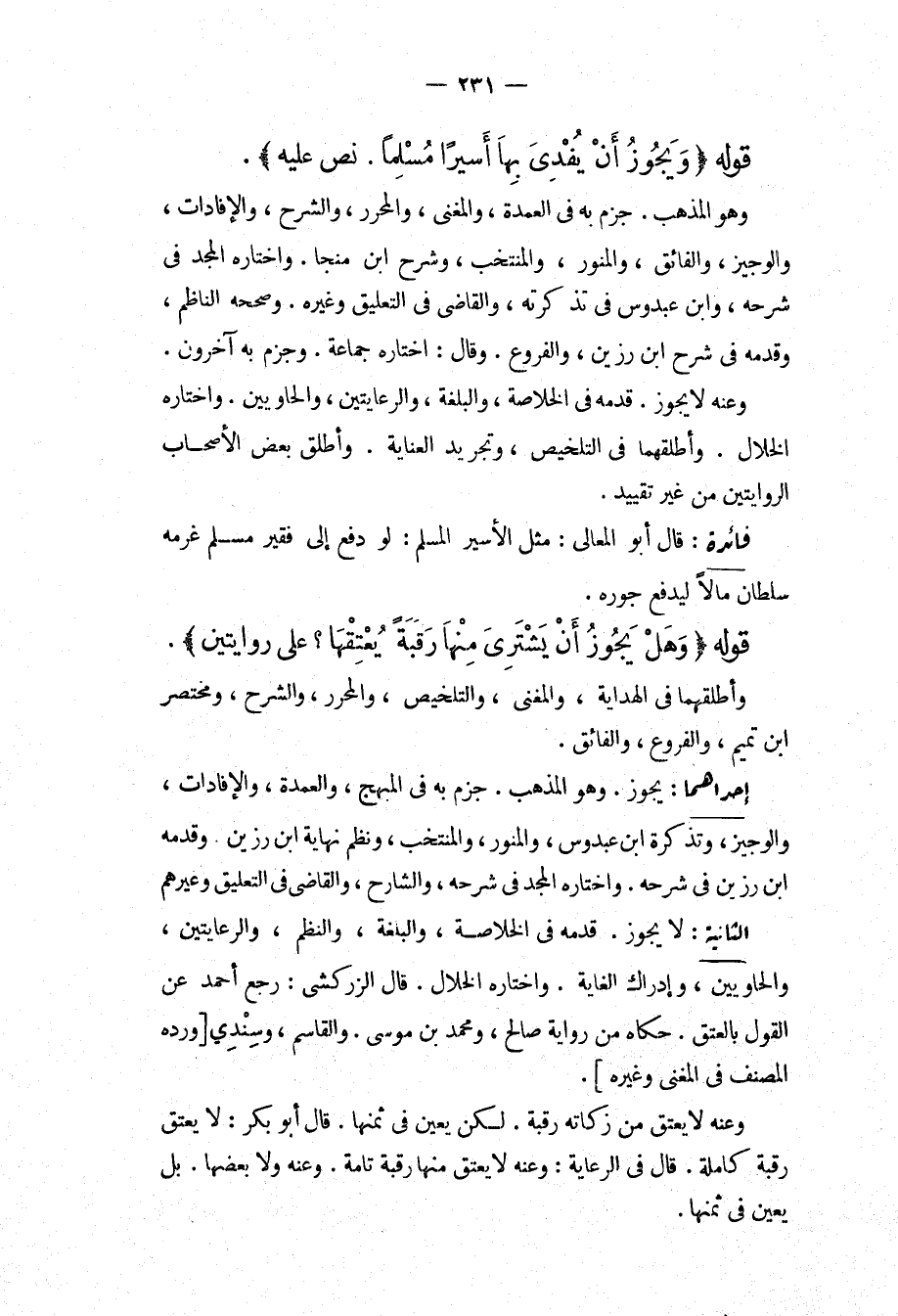 قَوْلُهُ (وَيَجُوزُ أَنْ يَفْدِيَ بِهَا أَسِيرًا مُسْلِمًا، نَصَّ عَلَيْهِ) ، وَهُوَ الْمَذْهَبُ. جَزَمَ بِهِ فِي الْعُمْدَةِ، وَالْمُغْنِي، وَالْمُحَرَّرِ، وَالشَّرْحِ، وَالْإِفَادَاتِ، وَالْوَجِيزِ، وَالْفَائِقِ، وَالْمُنَوِّرِ، وَالْمُنْتَخَبِ، وَشَرْحِ ابْنِ مُنَجَّى، وَاخْتَارَهُ الْمَجْدُ فِي شَرْحِهِ، وَابْنُ عَبْدُوسٍ فِي تَذْكِرَتِهِ، وَالْقَاضِي فِي التَّعْلِيقِ وَغَيْرُهُ، وَصَحَّحَهُ النَّاظِمُ، وَقَدَّمَهُ شَرْحُ ابْنِ رَزِينٍ، وَالْفُرُوعُ، وَقَالَ: اخْتَارَهُ جَمَاعَةٌ، وَجَزَمَ بِهِ آخَرُونَ، وَعَنْهُ لَا يَجُوزُ، قَدَّمَهُ فِي الْخُلَاصَةِ، وَالْبُلْغَةِ، وَالرِّعَايَتَيْنِ، وَالْحَاوِيَيْنِ، وَاخْتَارَهُ الْخَلَّالُ، وَأَطْلَقَهُمَا فِي التَّلْخِيصِ، وَتَجْرِيدِ الْعِنَايَةِ، وَأَطْلَقَ بَعْضُ الْأَصْحَابِ الرِّوَايَتَيْنِ مِنْ غَيْرِ تَقْيِيدٍ.