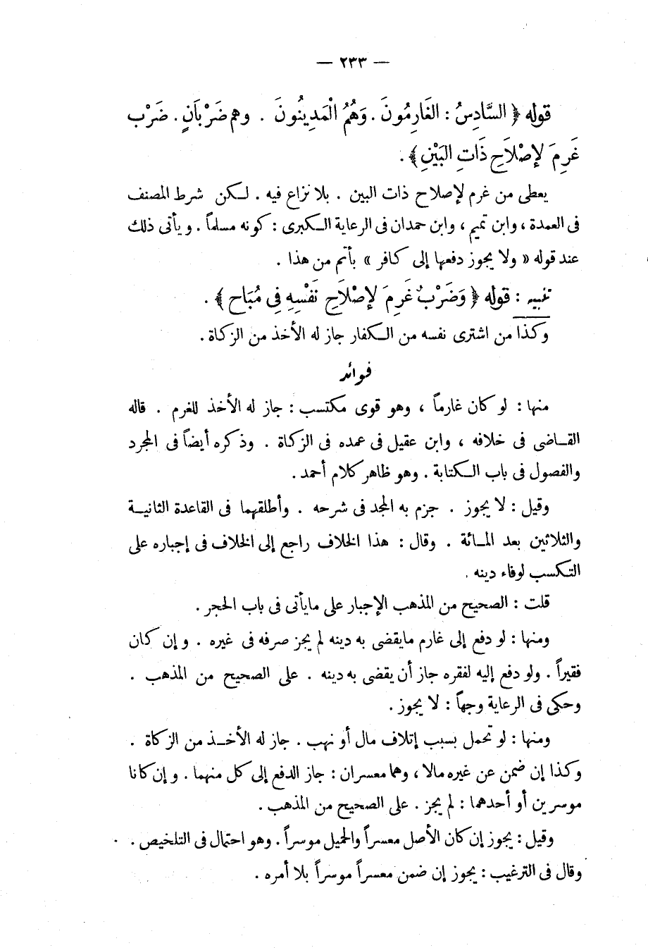 قَوْلُهُ (السَّادِسُ: الْغَارِمُونَ، وَهُمْ الْمَدِينُونَ. وَهُمْ ضَرْبَانِ. ضَرْبٌ غَرِمَ لِإِصْلَاحِ ذَاتِ الْبَيْنِ) يُعْطَى مَنْ غَرِمَ لِإِصْلَاحِ ذَاتِ الْبَيْنِ بِلَا نِزَاعٍ فِيهِ لَكِنْ شَرَطَ الْمُصَنِّفُ فِي الْعُمْدَةِ، وَابْنُ تَمِيمٍ، وَابْنُ حَمْدَانَ فِي الرِّعَايَةِ الْكُبْرَى: كَوْنَهُ مُسْلِمًا، وَيَأْتِي ذَلِكَ عِنْدَ قَوْلِهِ " وَلَا يَجُوزُ دَفْعُهَا إلَى كَافِرٍ " بِأَتَمَّ مِنْ هَذَا. تَنْبِيهٌ: قَوْلُهُ (وَضَرْبٌ غَرِمَ لِإِصْلَاحِ نَفْسِهِ فِي مُبَاحٍ) ، وَكَذَا مَنْ اشْتَرَى نَفْسَهُ مِنْ الْكُفَّارِ جَازَ لَهُ الْأَخْذُ مِنْ الزَّكَاةِ.